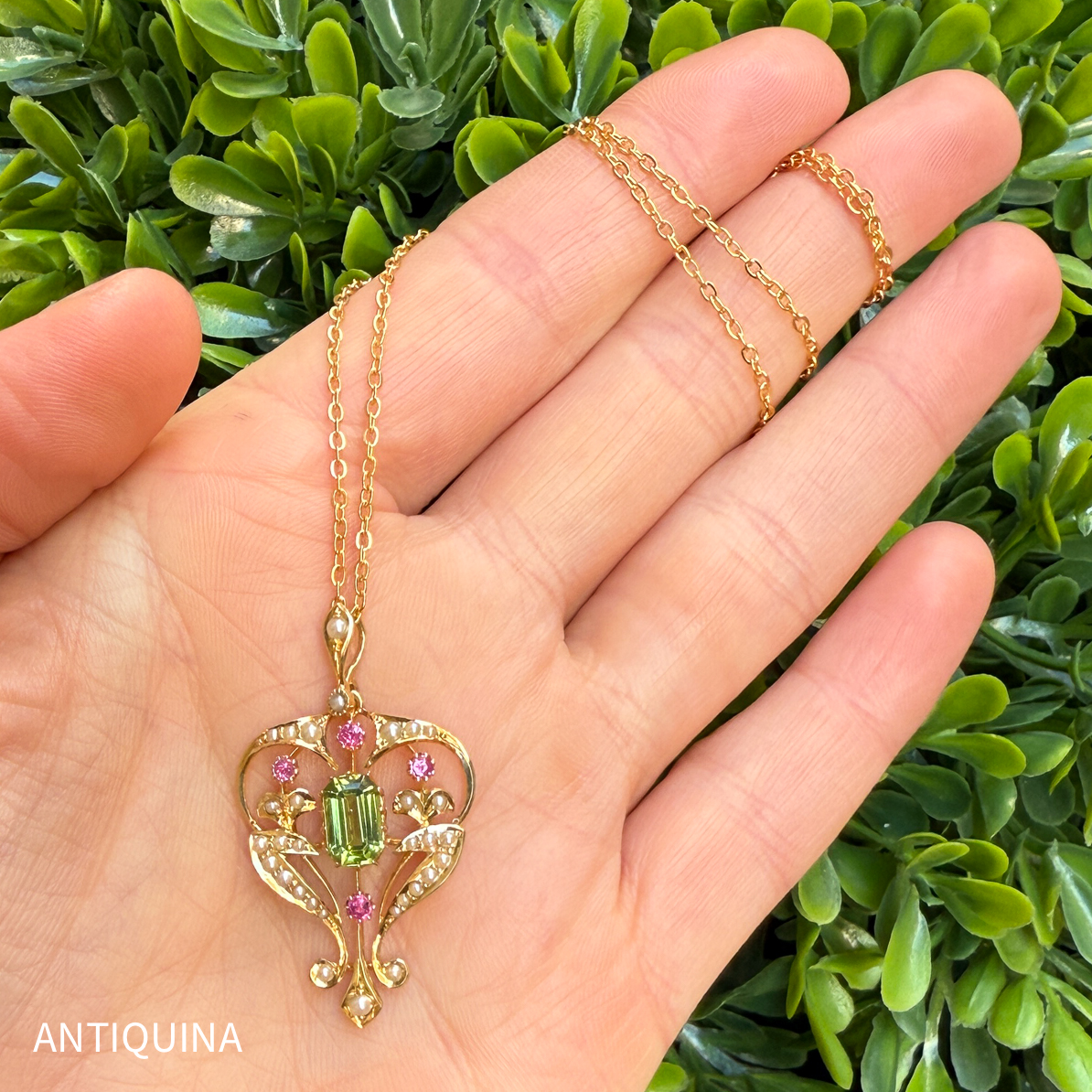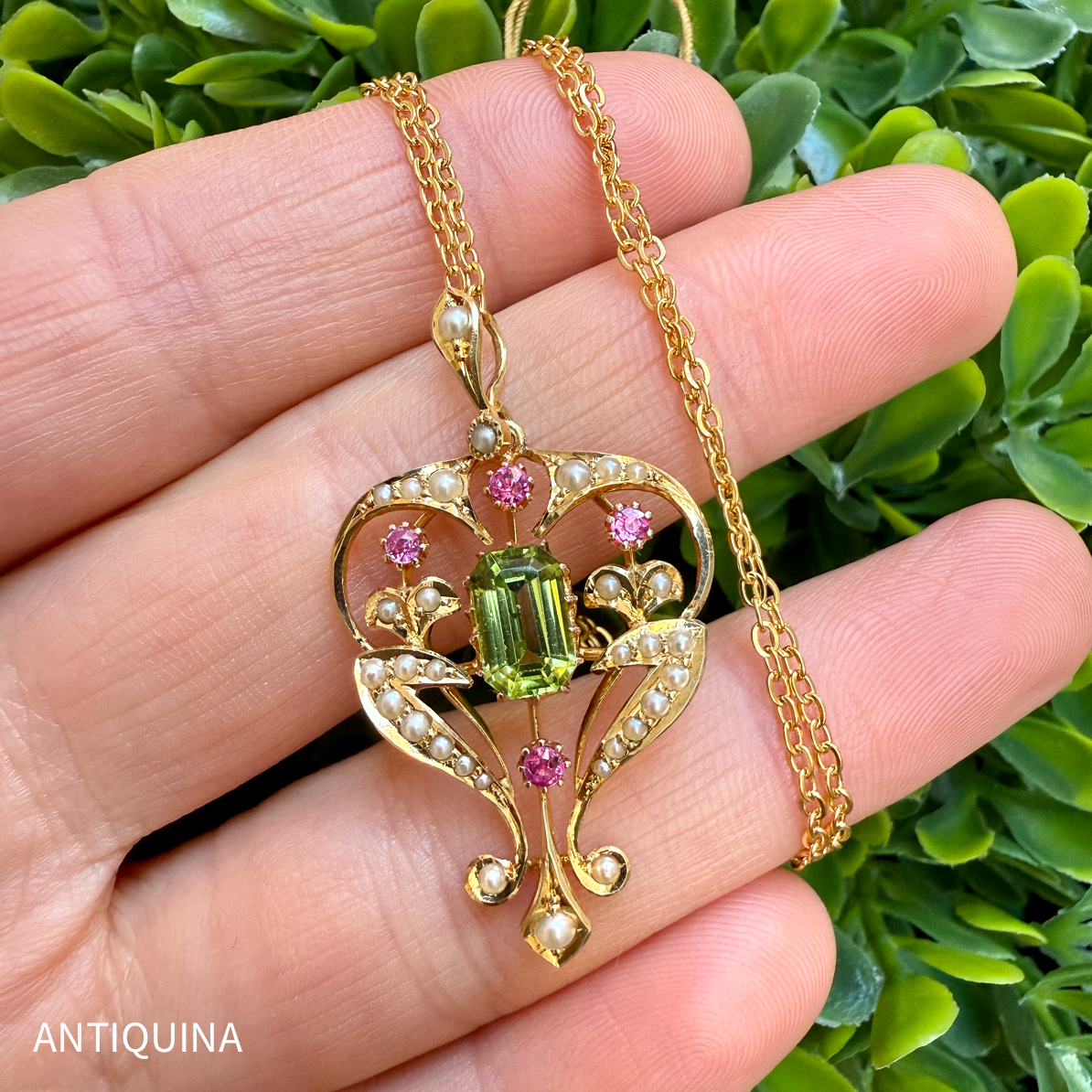 Antiker Suffragetten Anhänger 15 Karat Gold Peridot Rubin Saatperle um 1890/1900