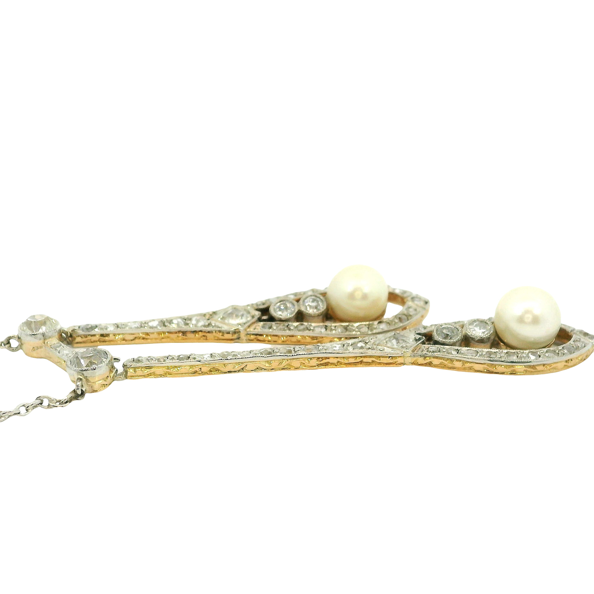 in durchbrochen gearbeiteter Tropfenform, je besetzt mit Zuchtperle und insgesamt acht Diamanten im Altschliff,