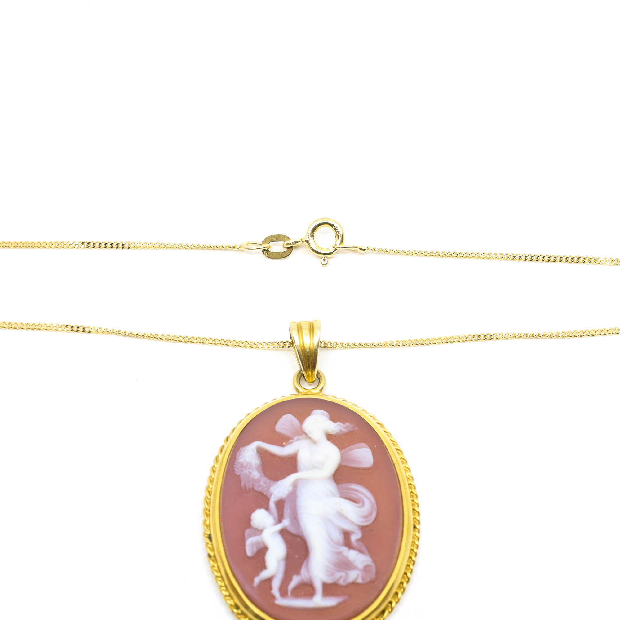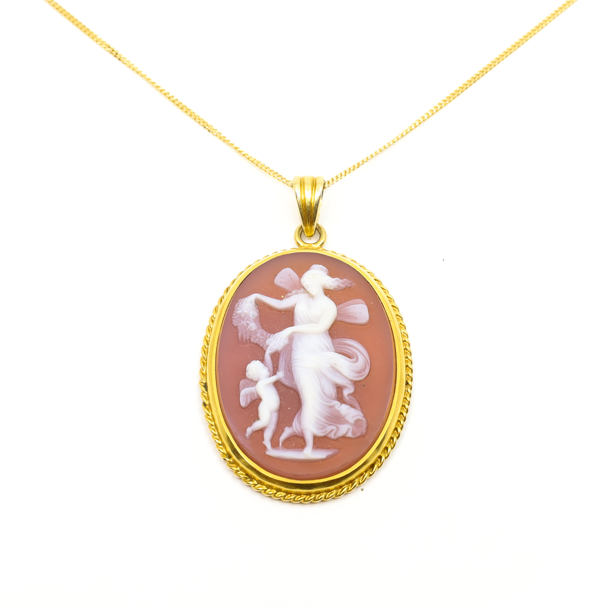 Die Kamee ist in einer 14 karätigen schlichten und zeitlosen Goldfassung gearbeitet, die dazu passende, später ergänzte Kette ist ebenfalls aus 14 Karat Gelbgold.