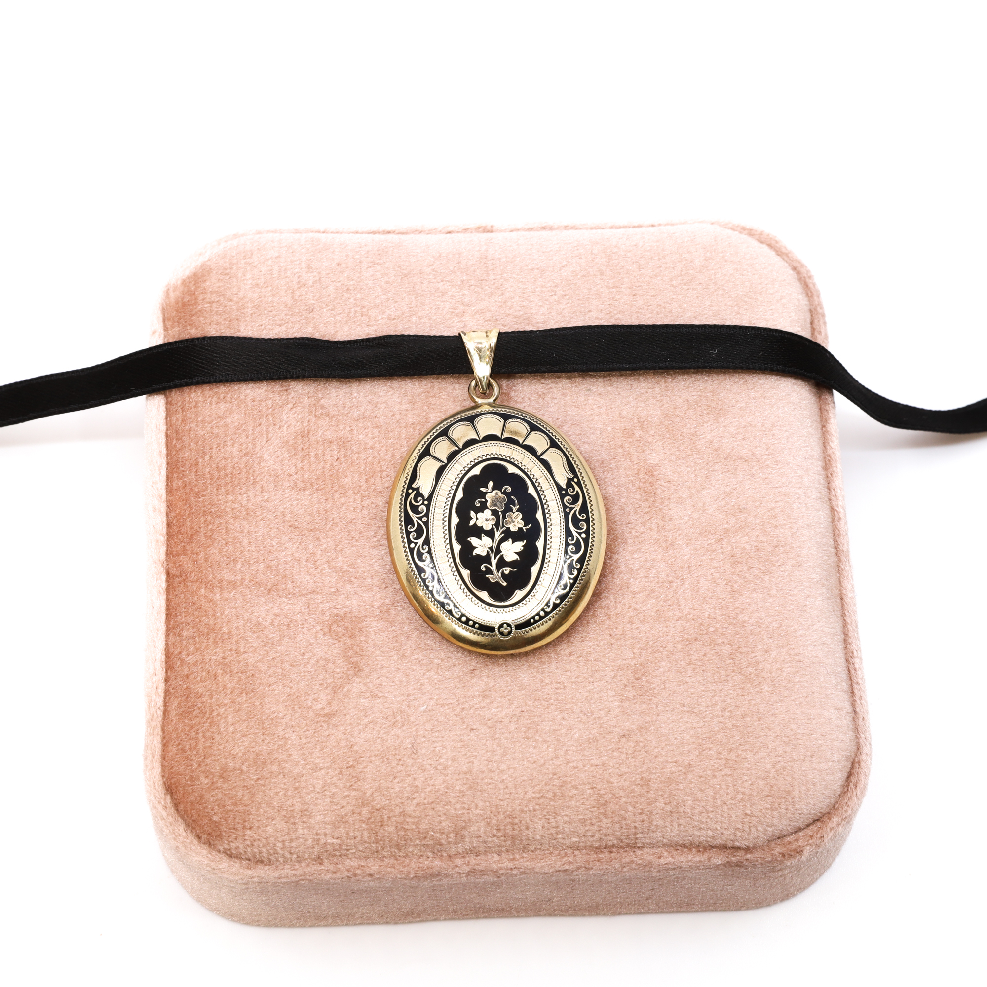 Wunderschönes, antikes Medaillon, Anhänger, zweite Hälfte 19. Jahrhundert, Vorderseite schwarz emailliert,