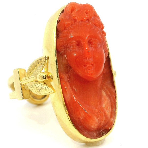 Die Koralle wurde in eine solide, antikisierende Fassung aus 750er (18 Karat) Gelbgold eingefasst.