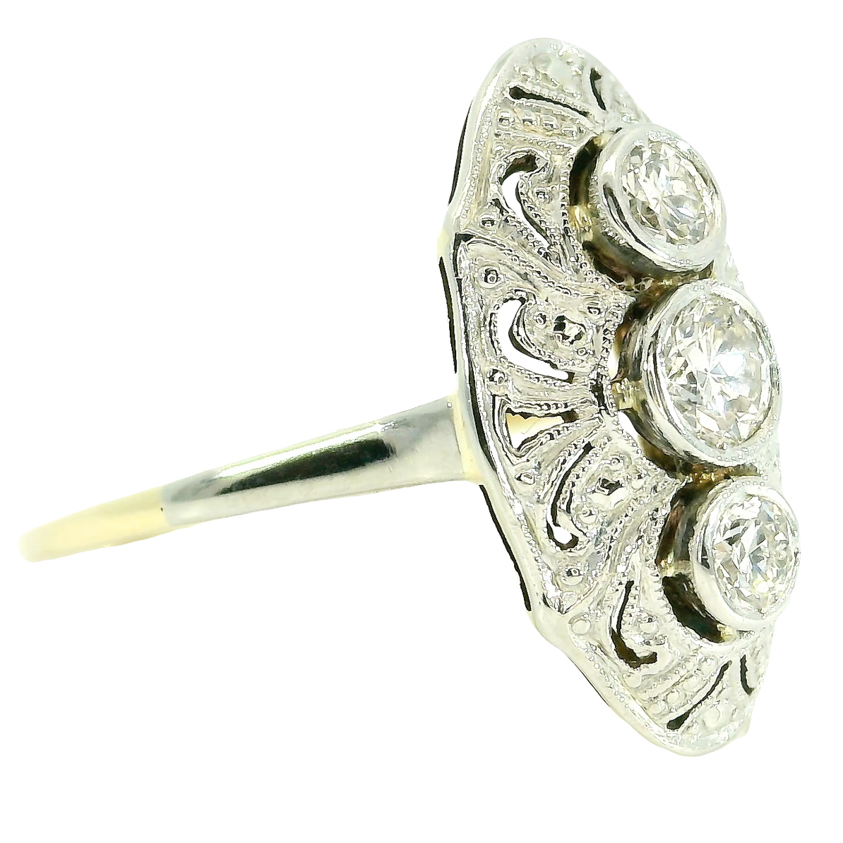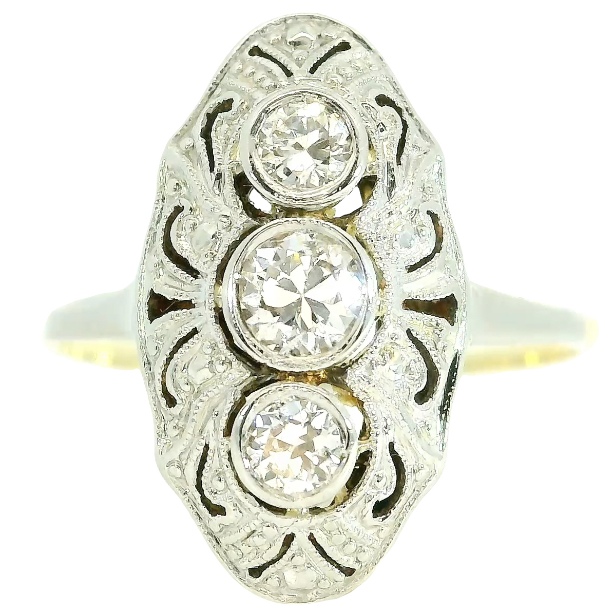 navetteförmig gestalteter Ringkopf besetzt mit drei Diamanten, umgeben von Millgriff Technik, schmale platinierte Ringschultern,