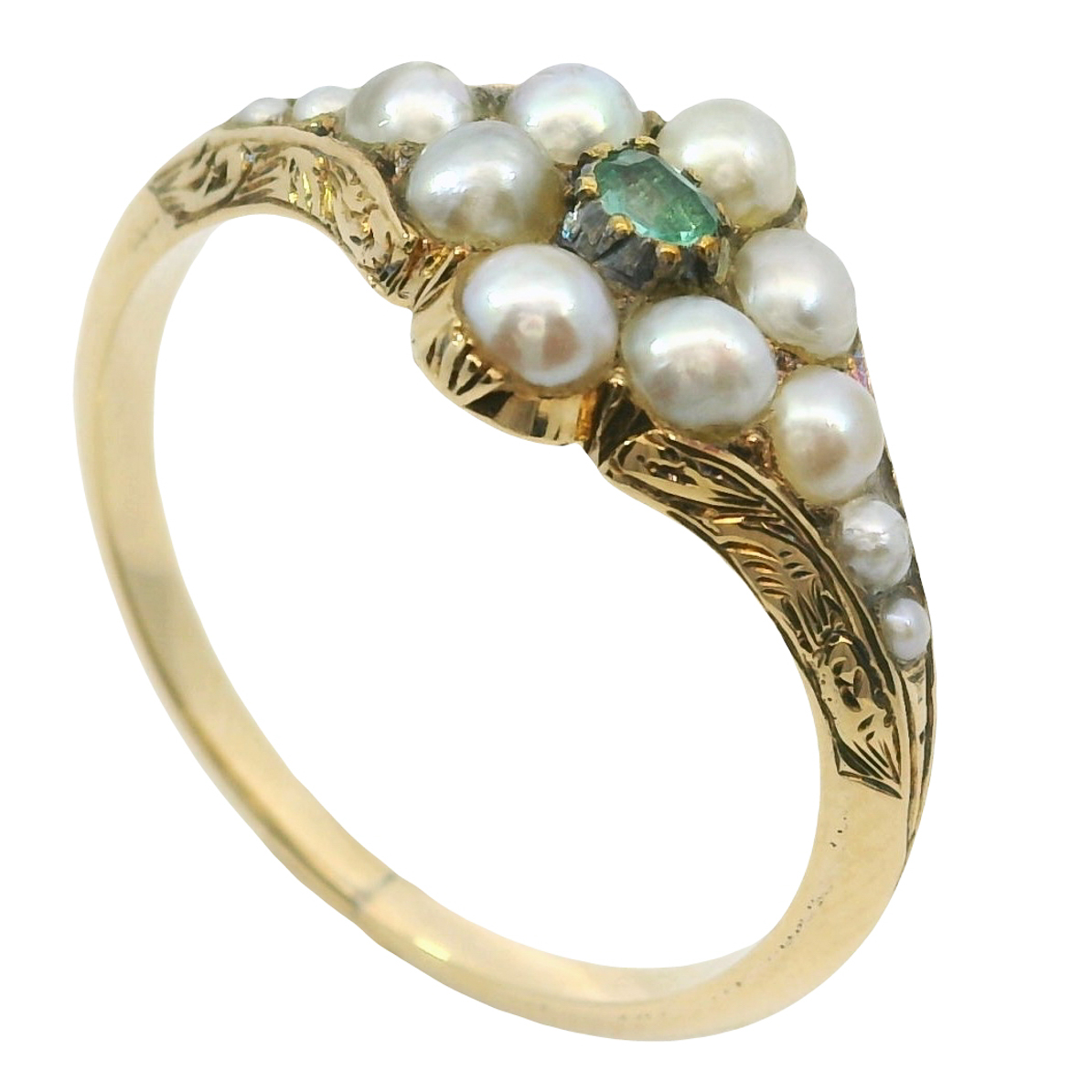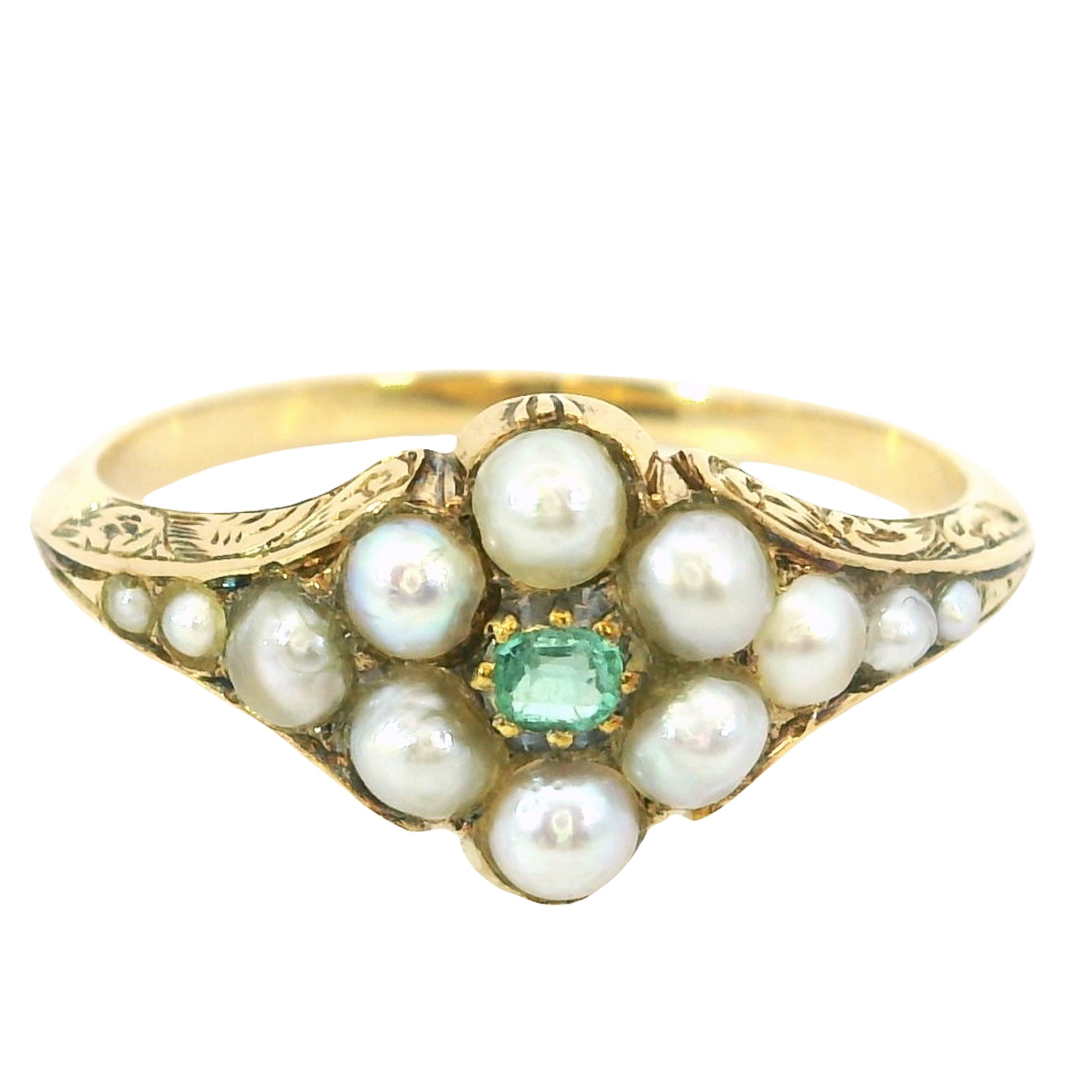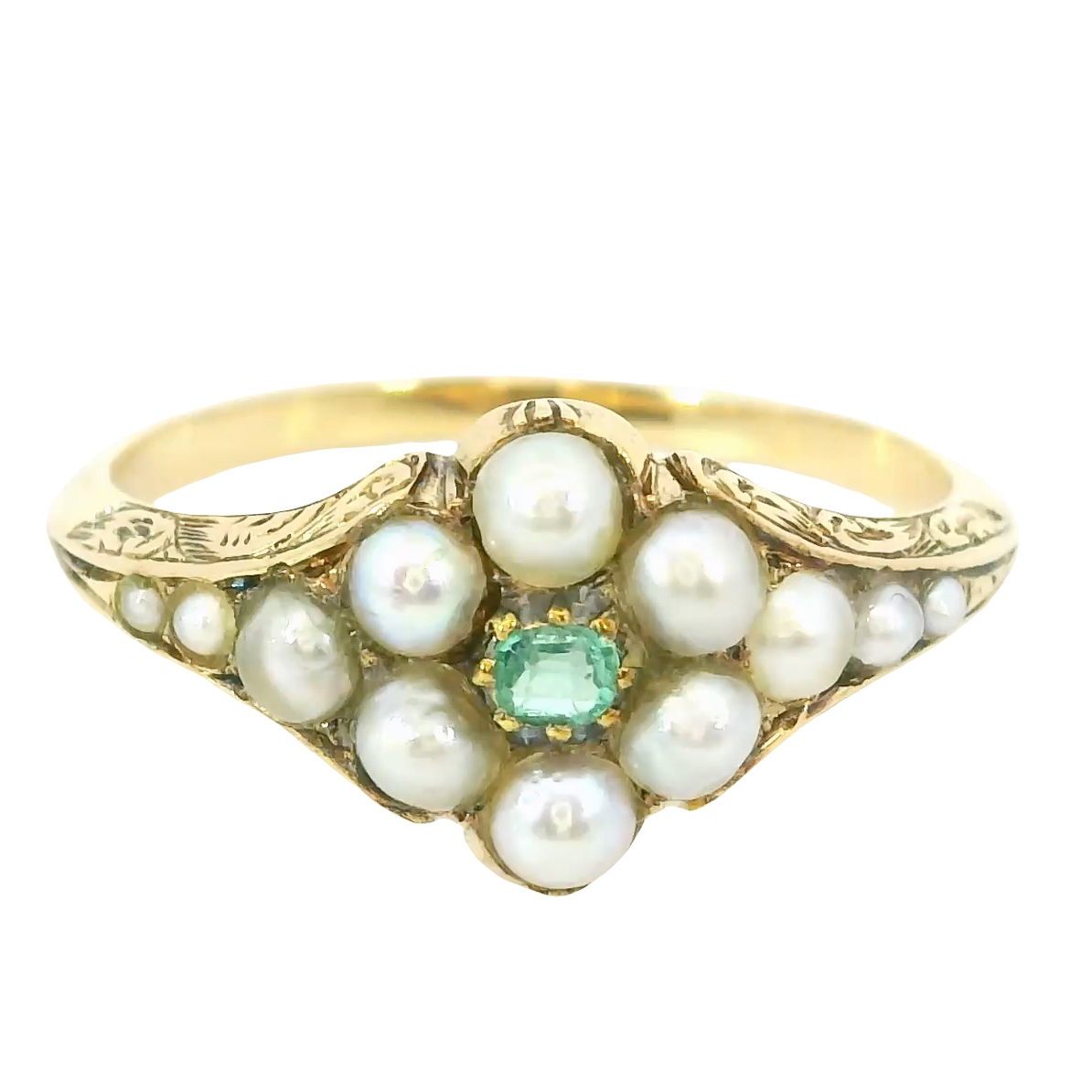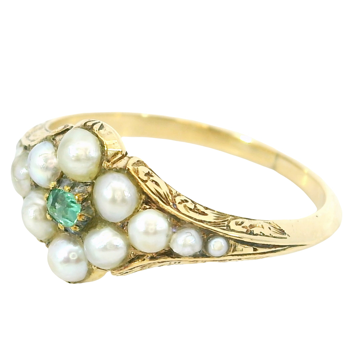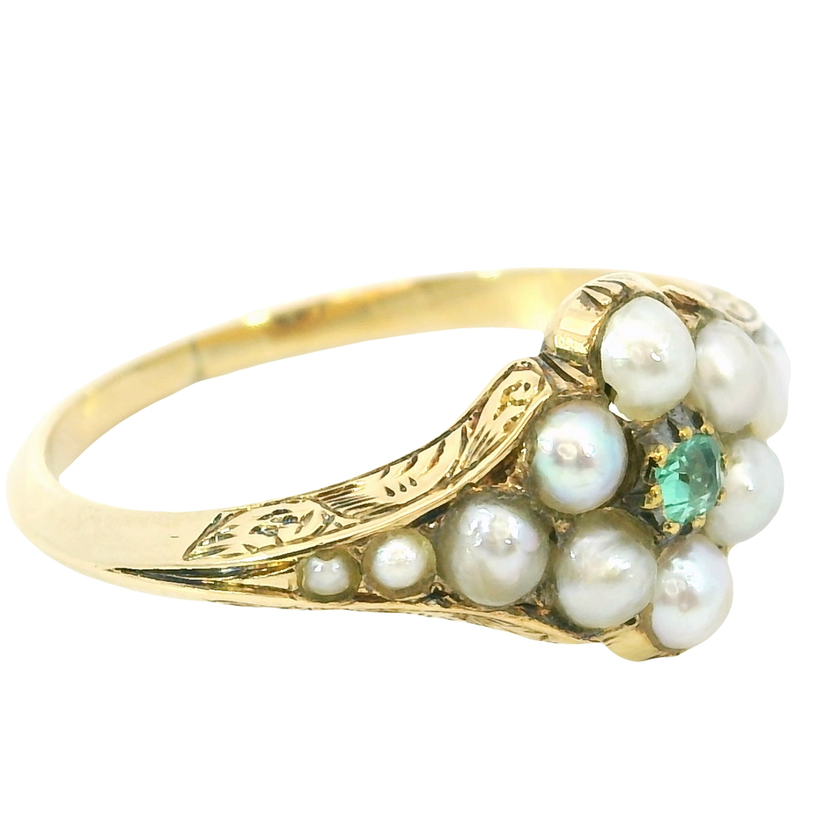Antiker Blüten Ring Belle Epoque um 1880/90 14 Karat Gold Smaragd Perlen