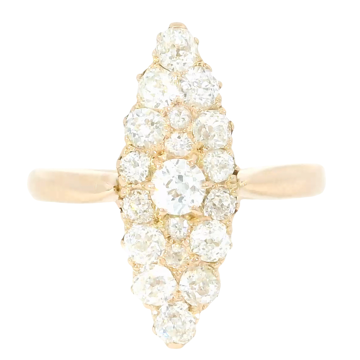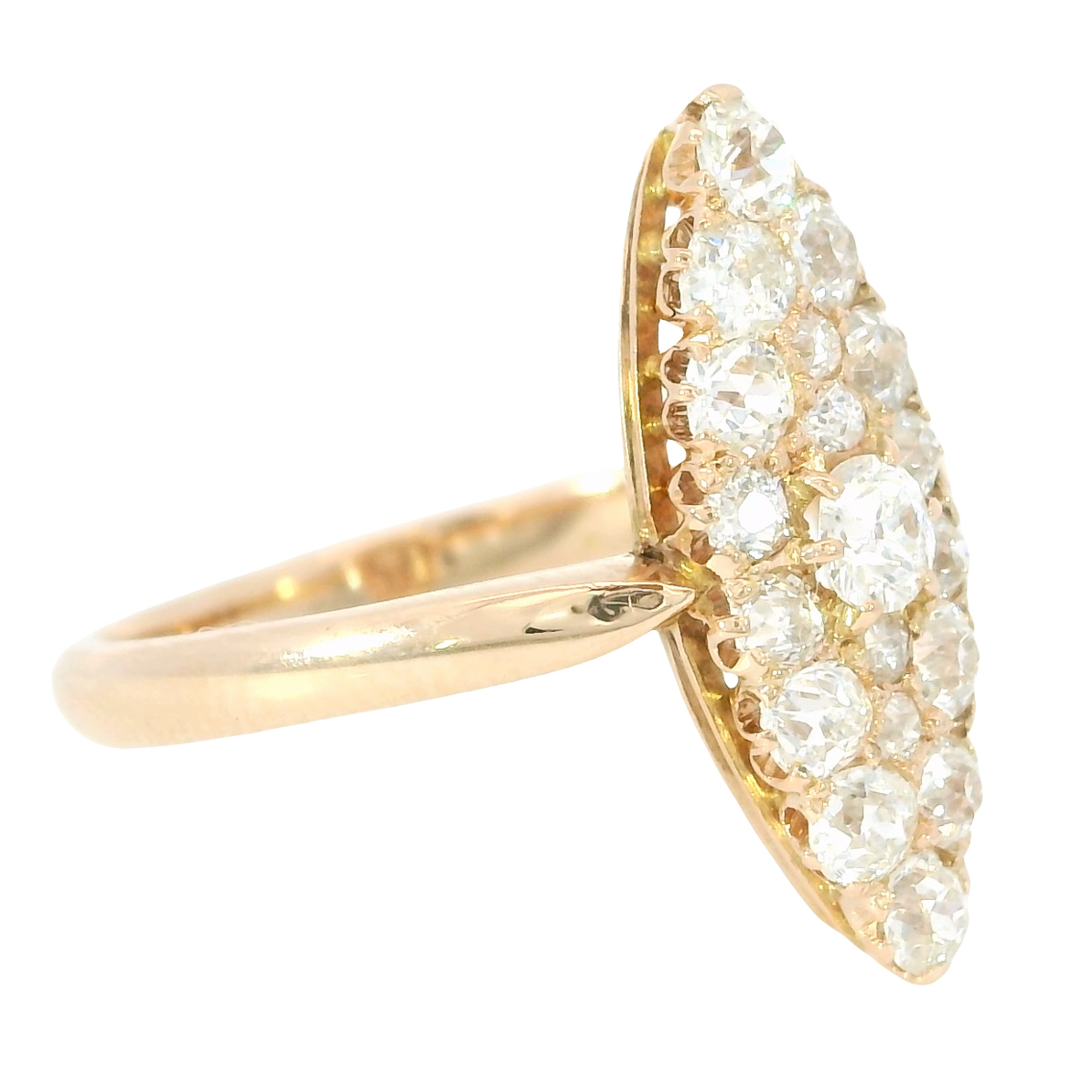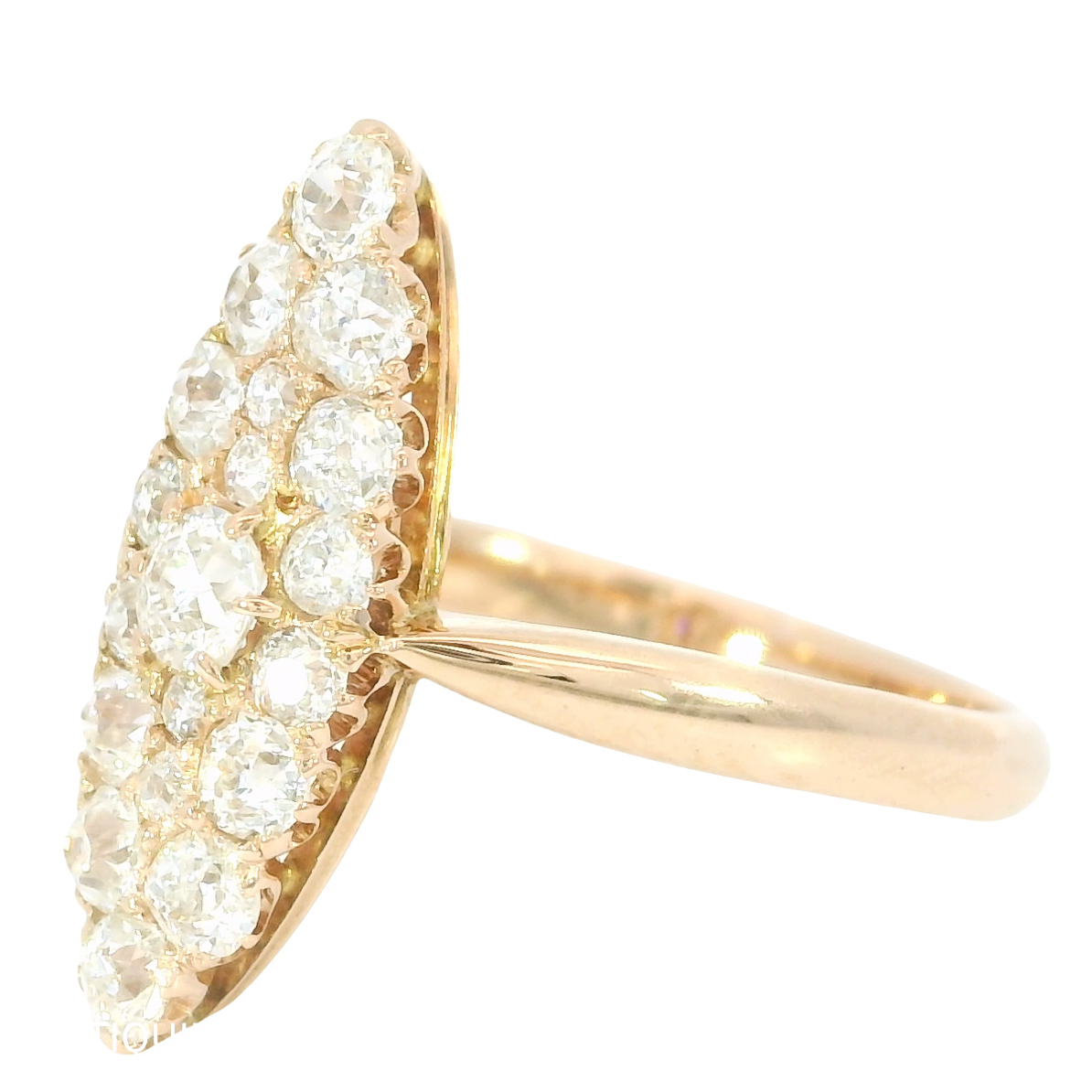 flacher Ringkopf marquiseförmig gestaltet, zahlreich besetzt mit Diamanten, elegante, schmal zulaufende Ringschultern,