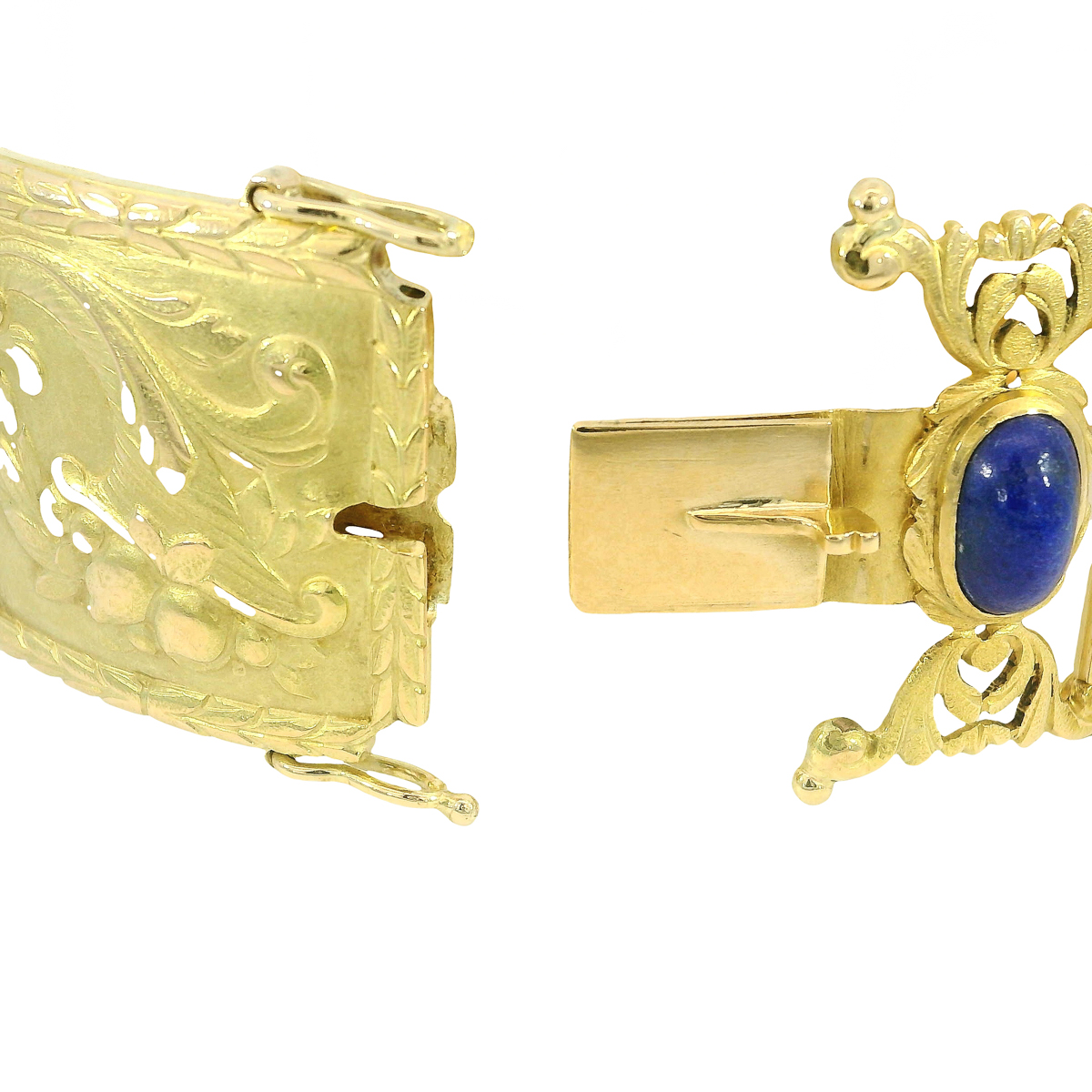klassizistischen und früh-jugendstiltypischen Ornamenten sowie der leuchtenden Eleganz tiefblauer Lapislazuli-Cabochons.