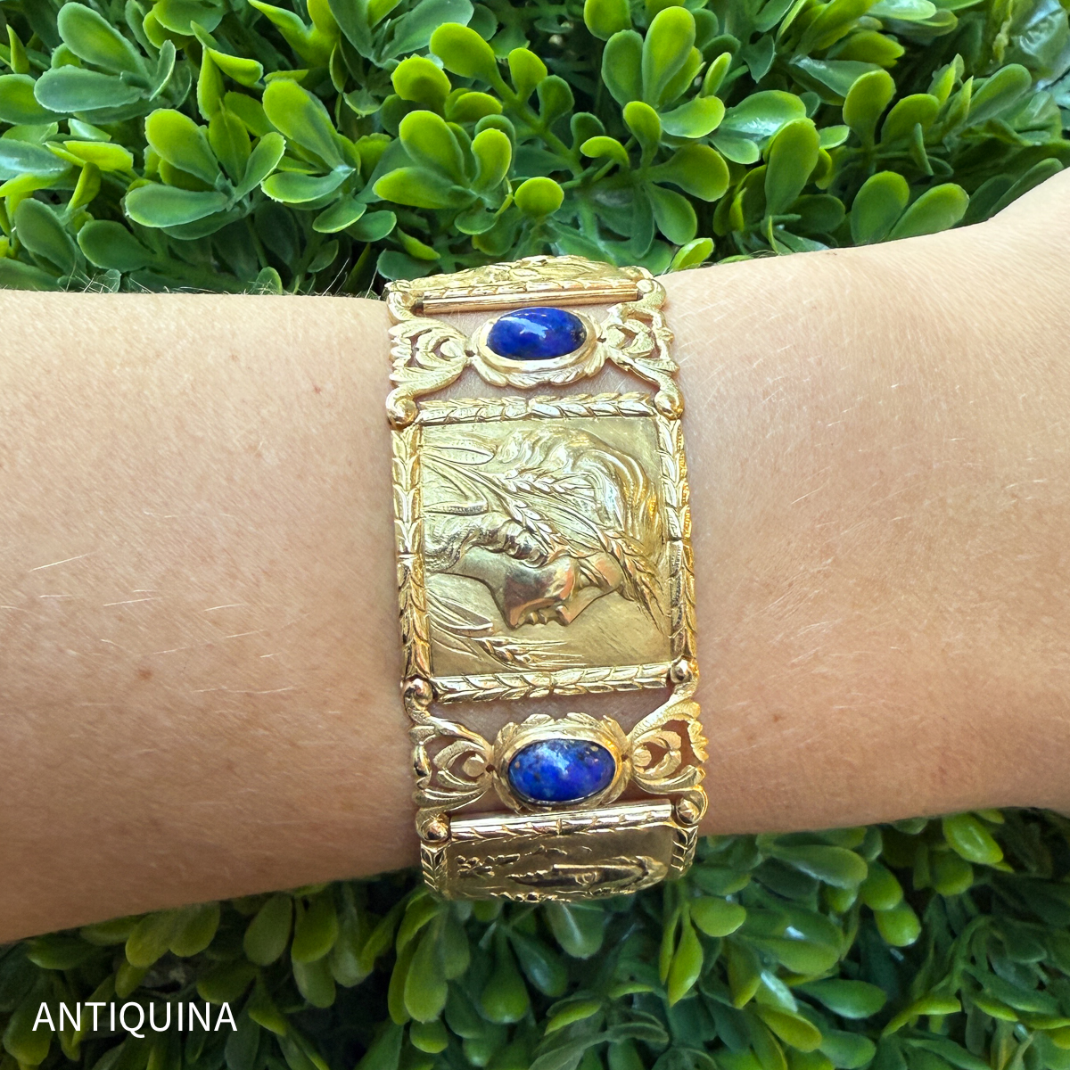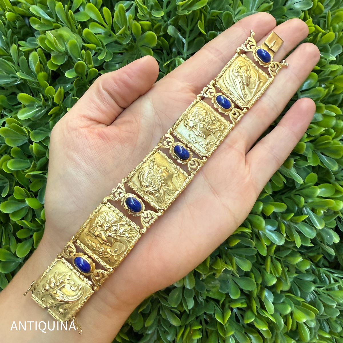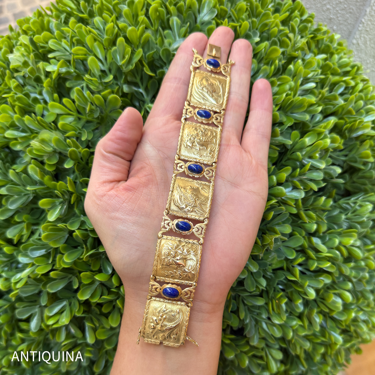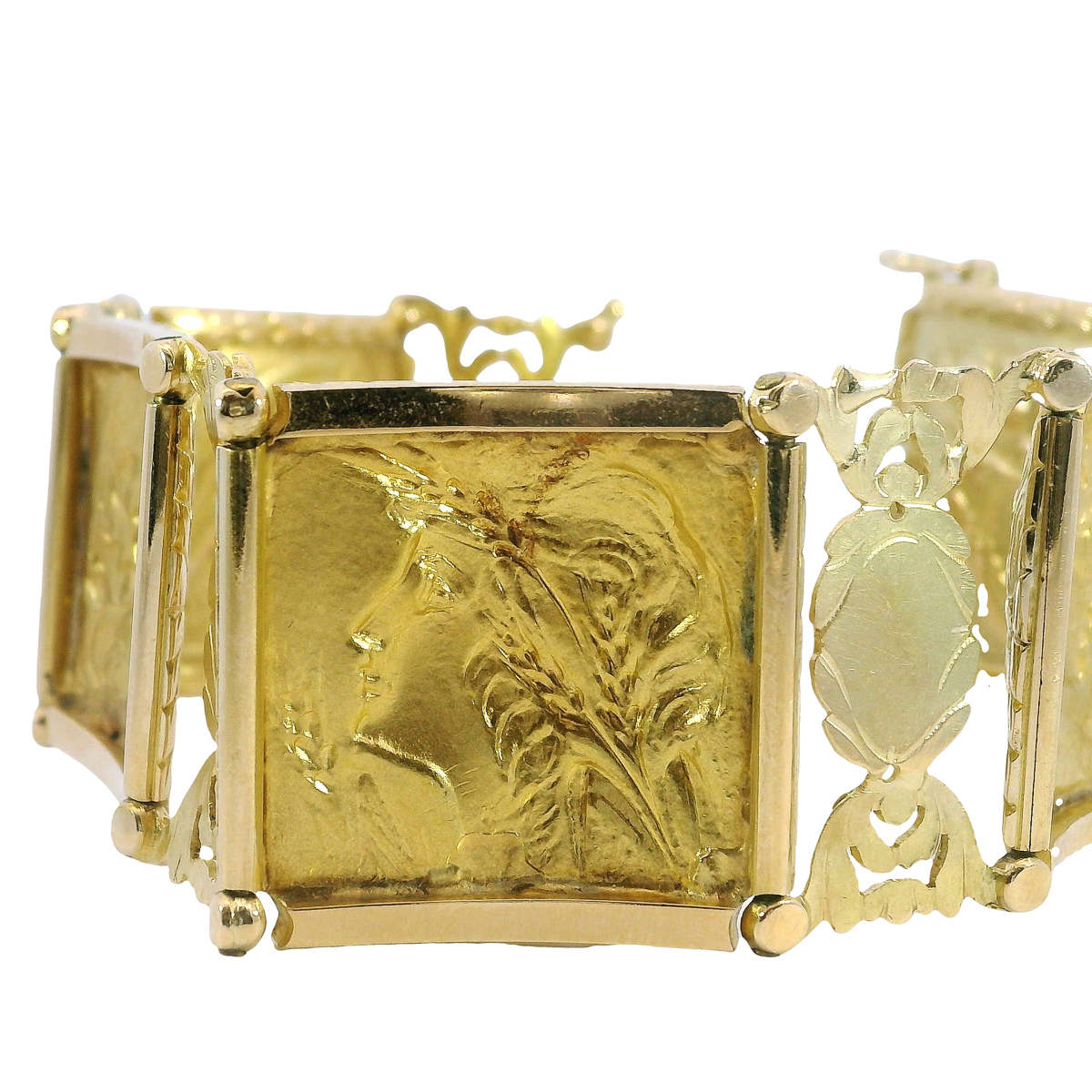 Das antike Armband besteht aus mehreren rechteckigen, leicht gewölbten Gliedern, die jeweils detailreich reliefiert sind.