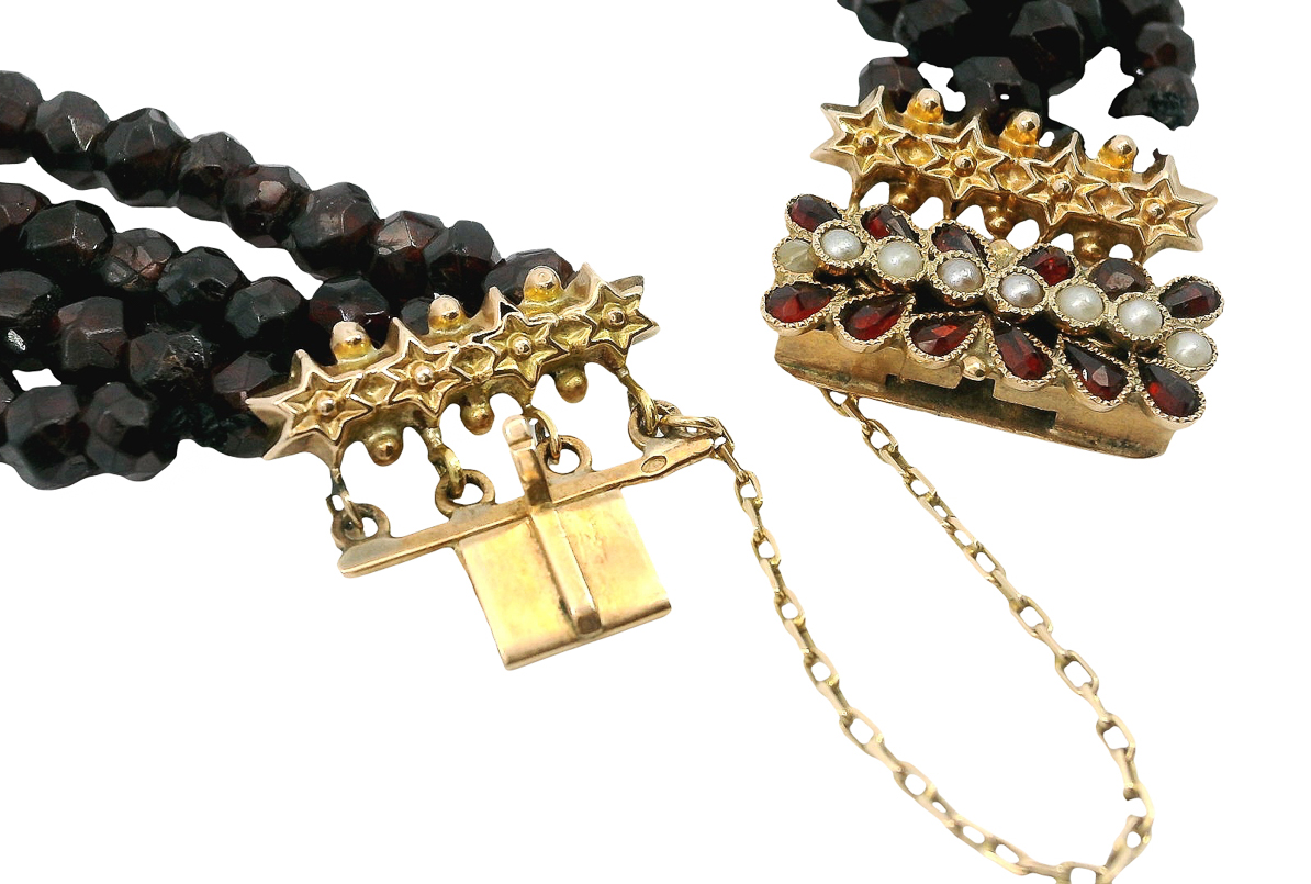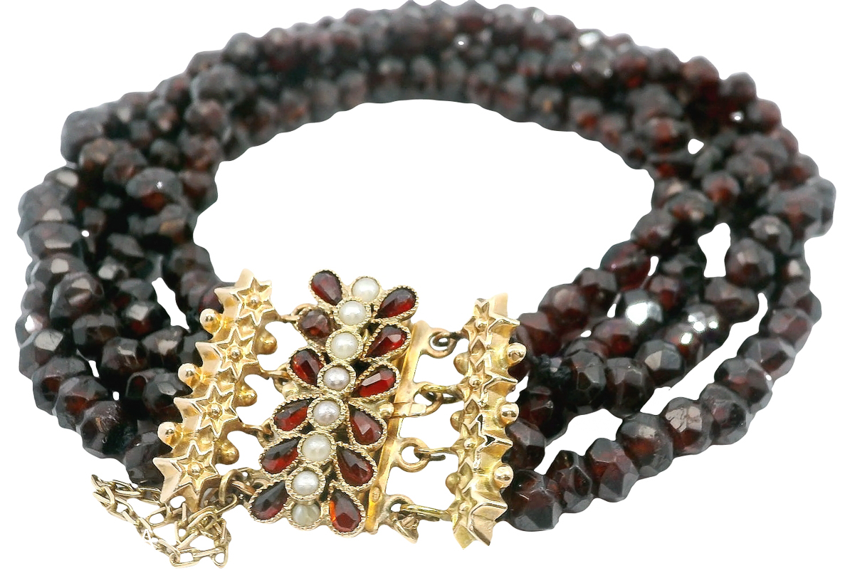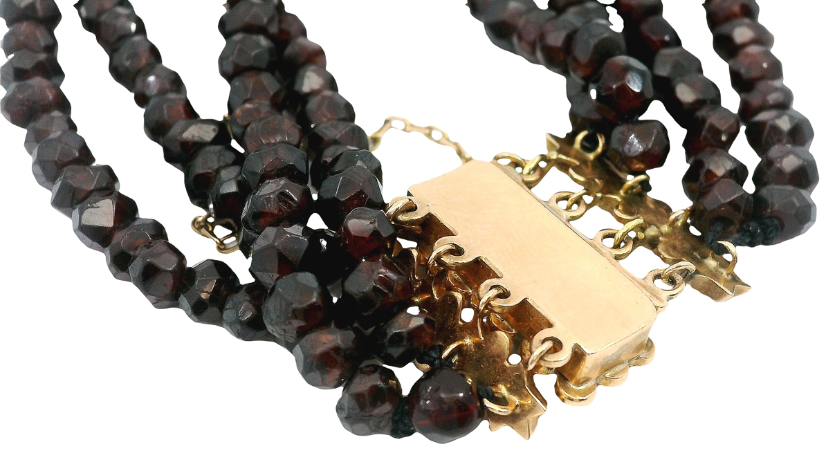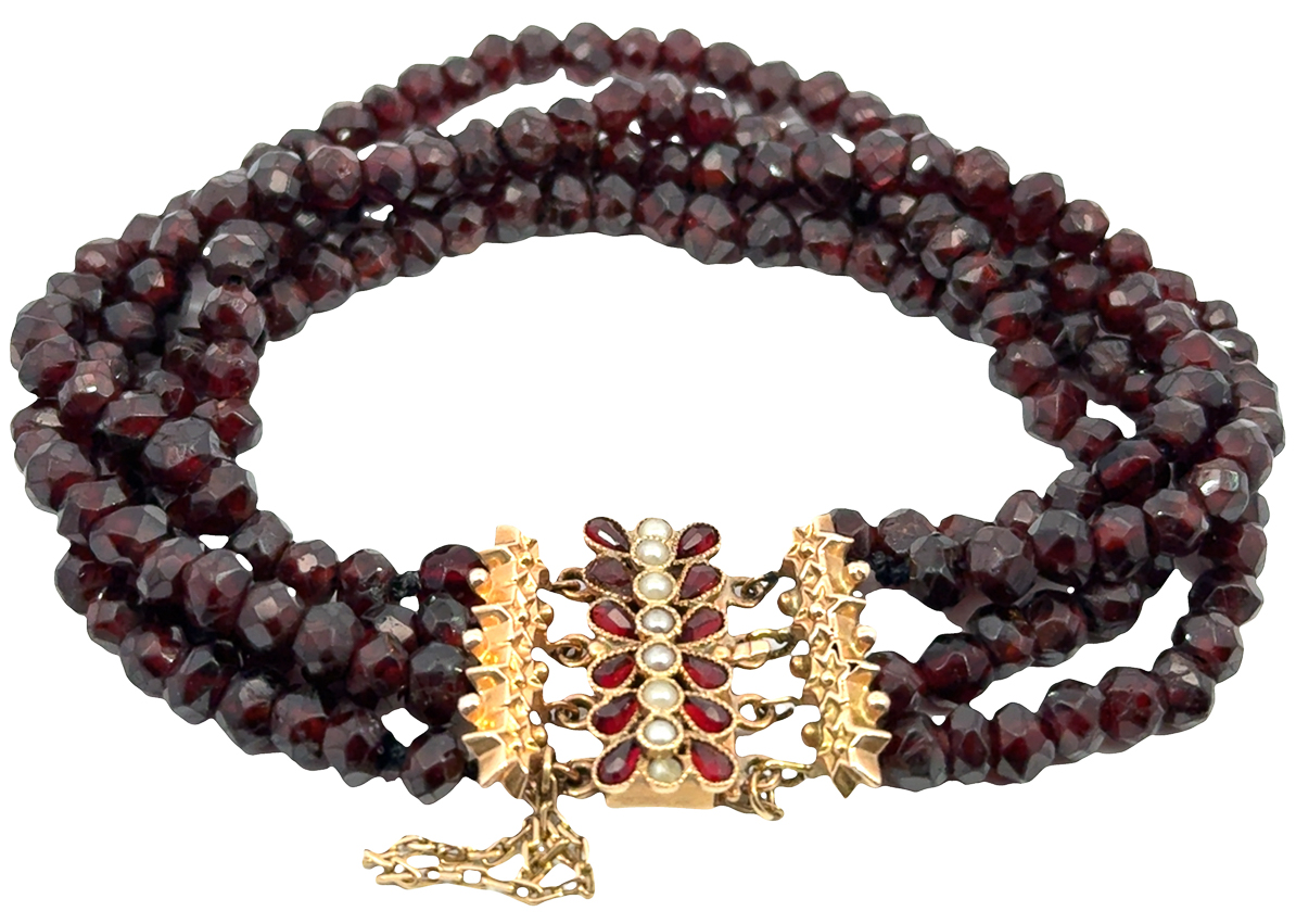 Feines antikes Granat Armband, zweite Hälfte 19. Jahrhundert, viersträngig mit äußerst dekorativer Schließe,