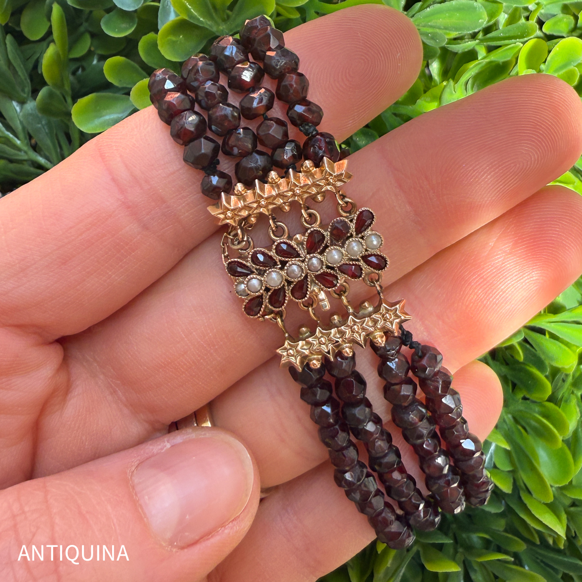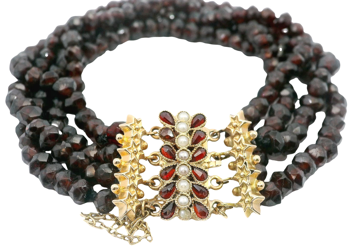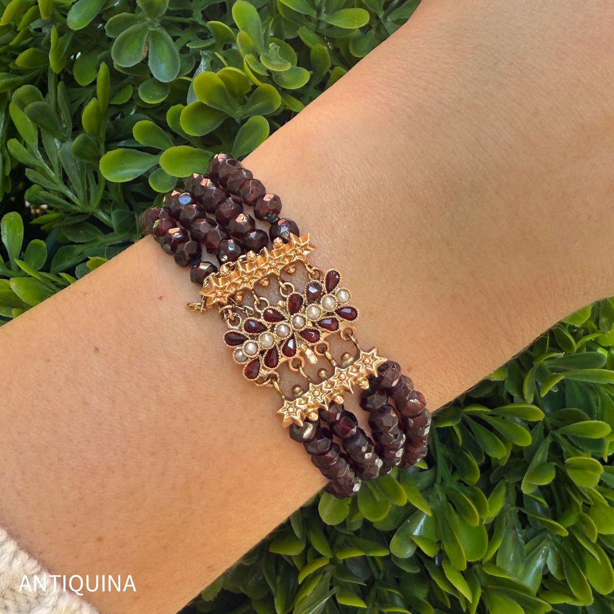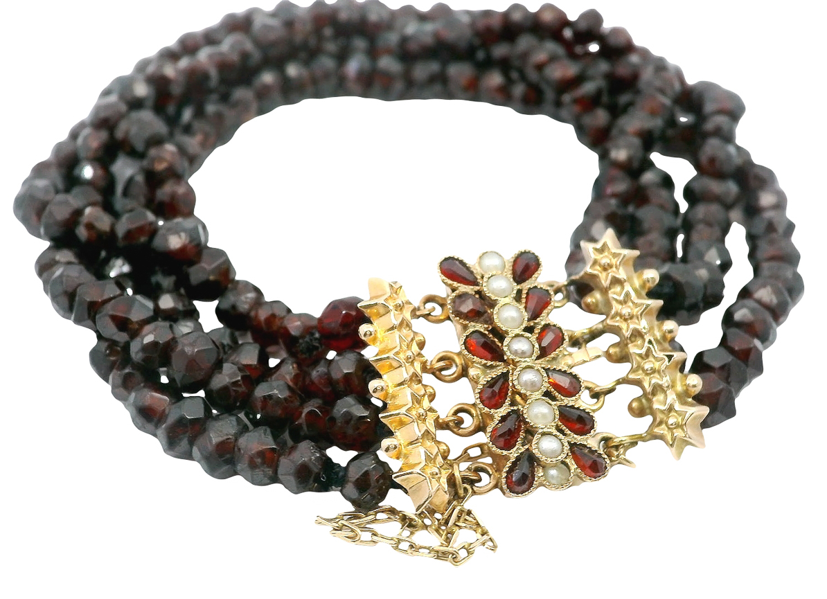 Feines antikes Granat Armband, zweite Hälfte 19. Jahrhundert, viersträngig mit äußerst dekorativer Schließe,