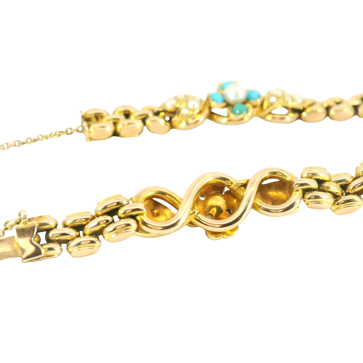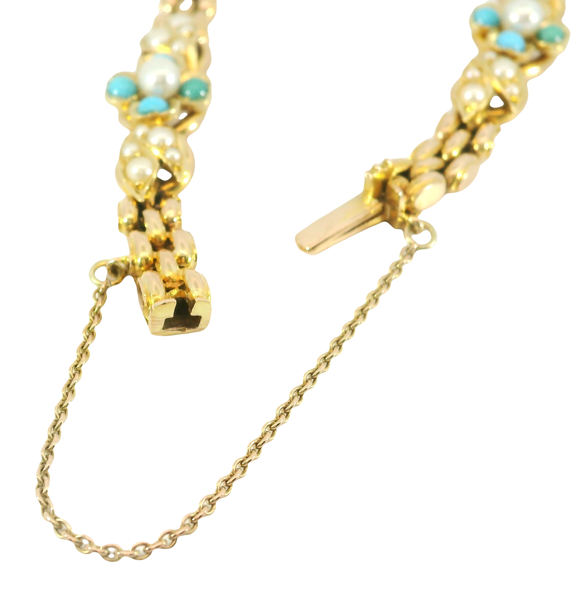 besetzt mit Türkisen und Saatperlchen, mit Sicherheitskettchen, sehr guter Erhaltungszustand