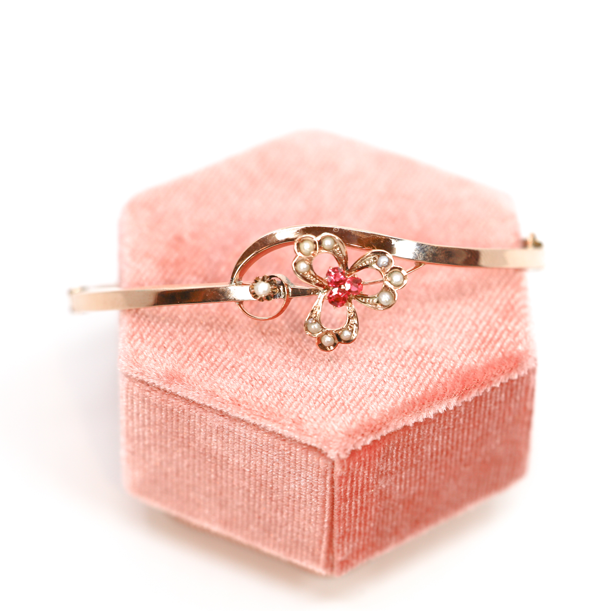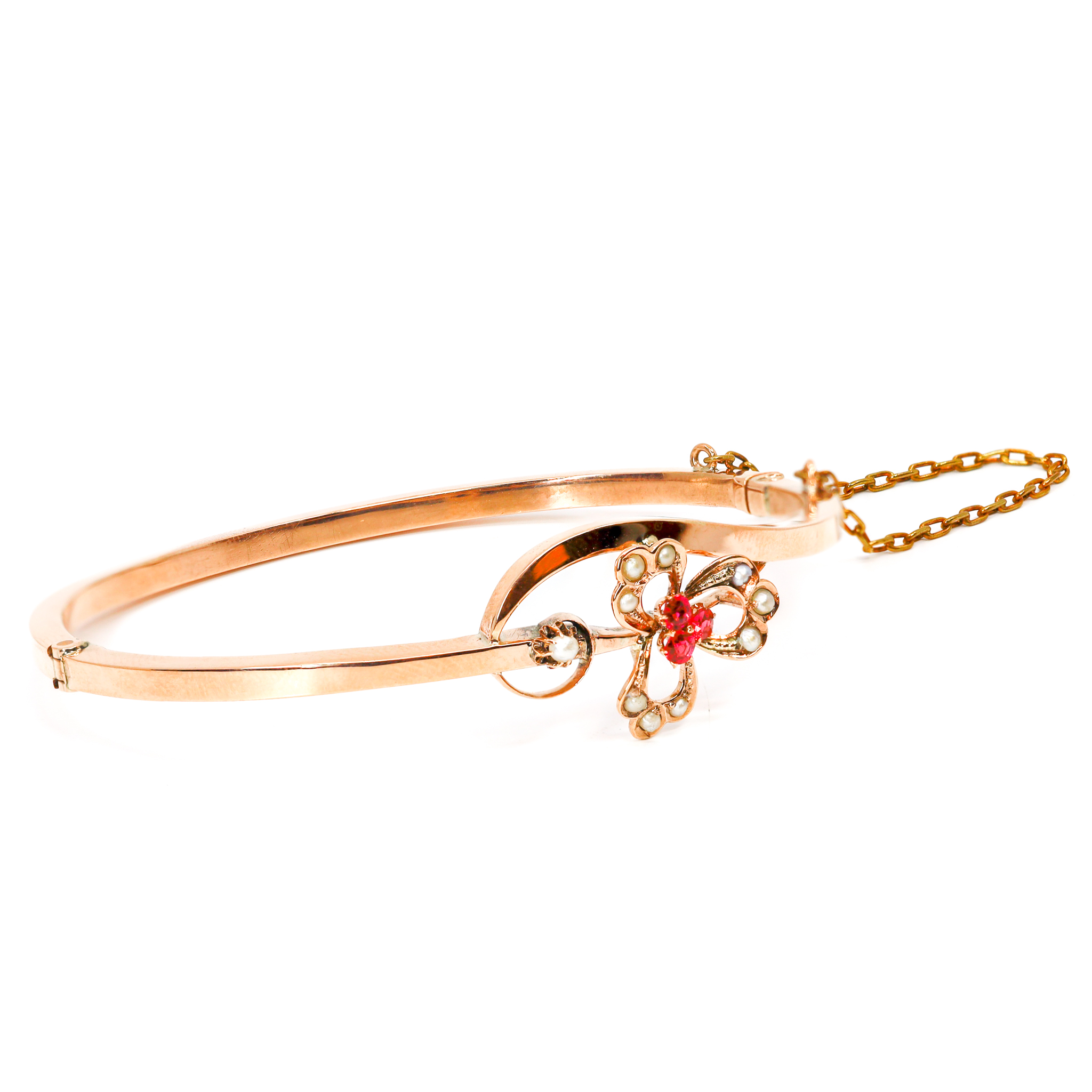 Wunderschöner antiker Jugendstil Armreif,Jahrhundertwernde um 1900, gearbeitet in Gelbgold, mittig stilsiertes Kleeblatt besetzt mit drei pinken Turmalinen,