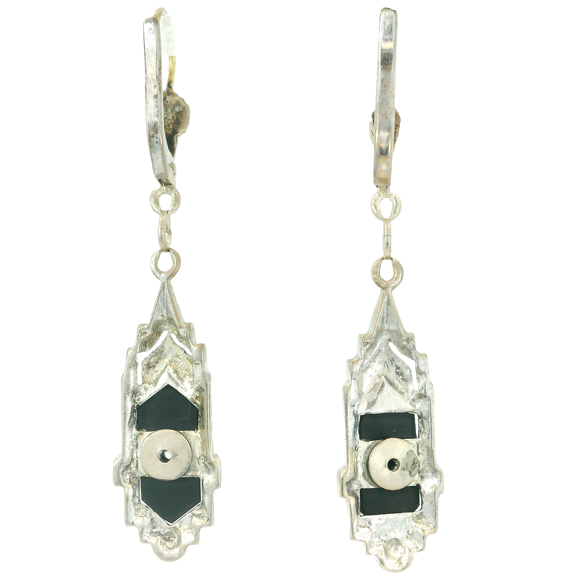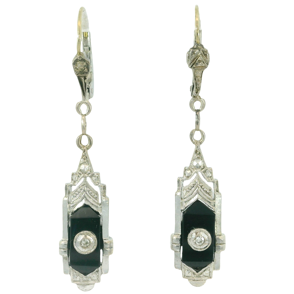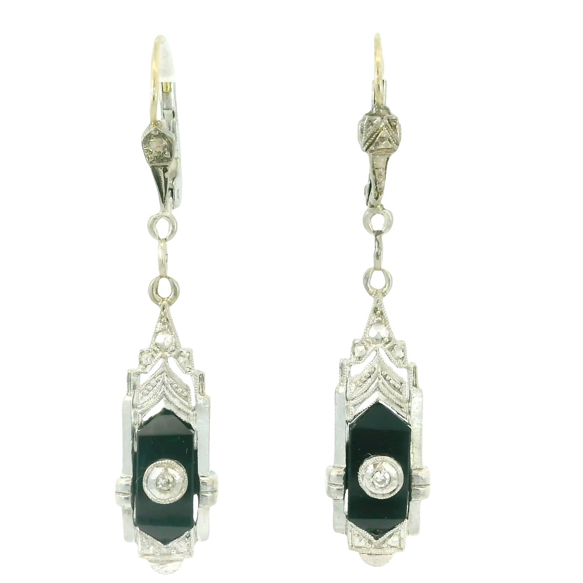 Art Deco Ohrringe um 1925 Silber mit 585 Goldbügel Onyx & kleiner Diamant