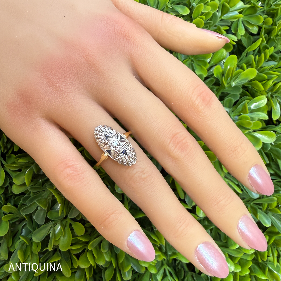 A sparkling old-cut diamond sits in the center, captivating with its depth and characteristic fire.