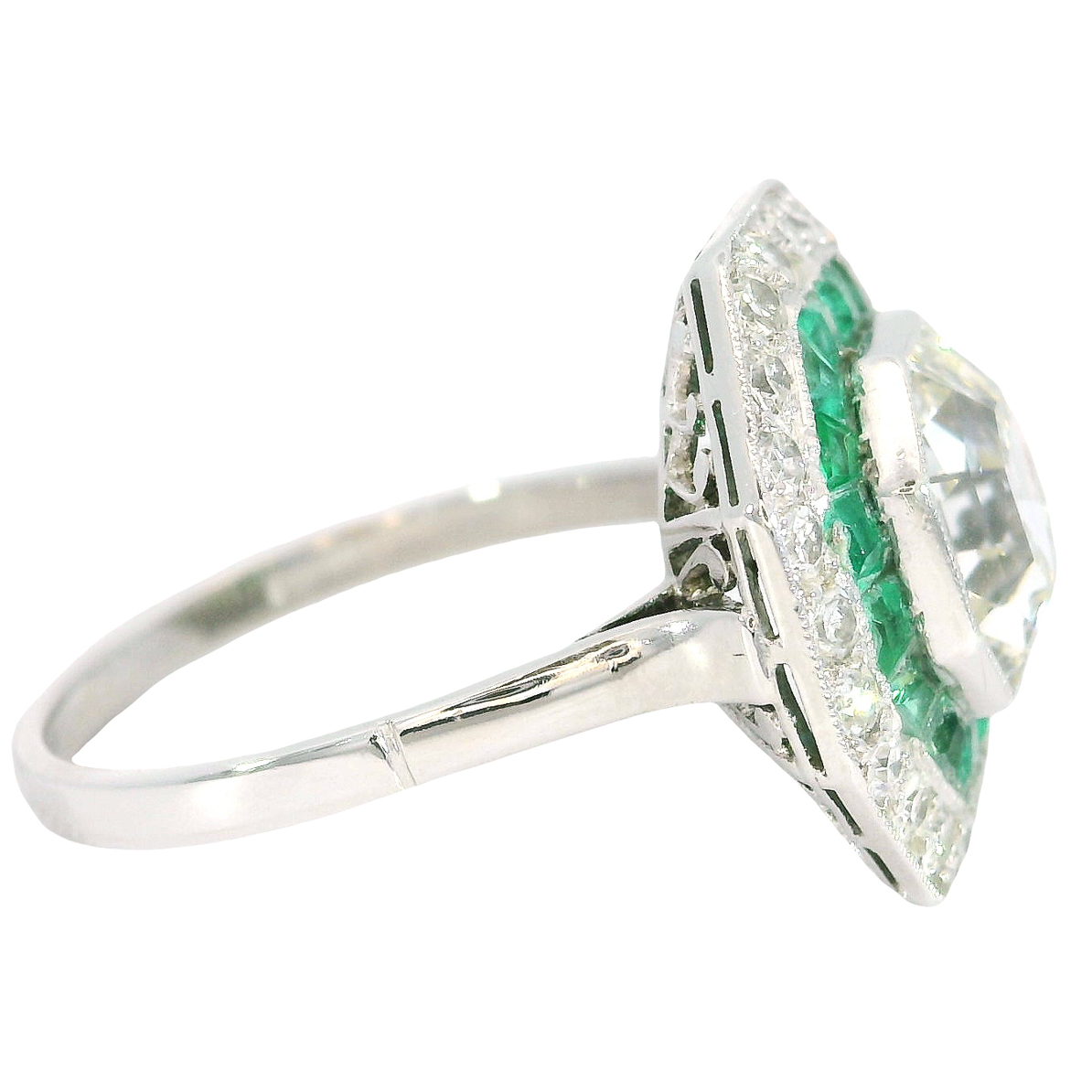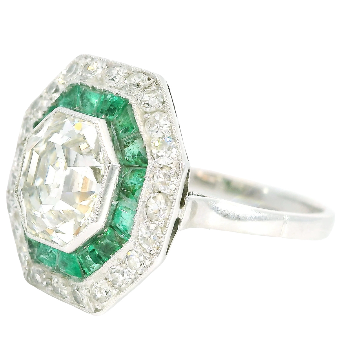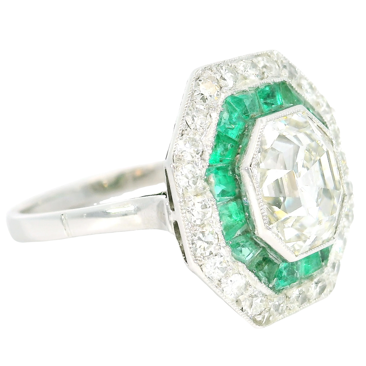 Art Deco platinum ring with a 2.5 ct asscher diamond and emeralds, Paris, circa 1925