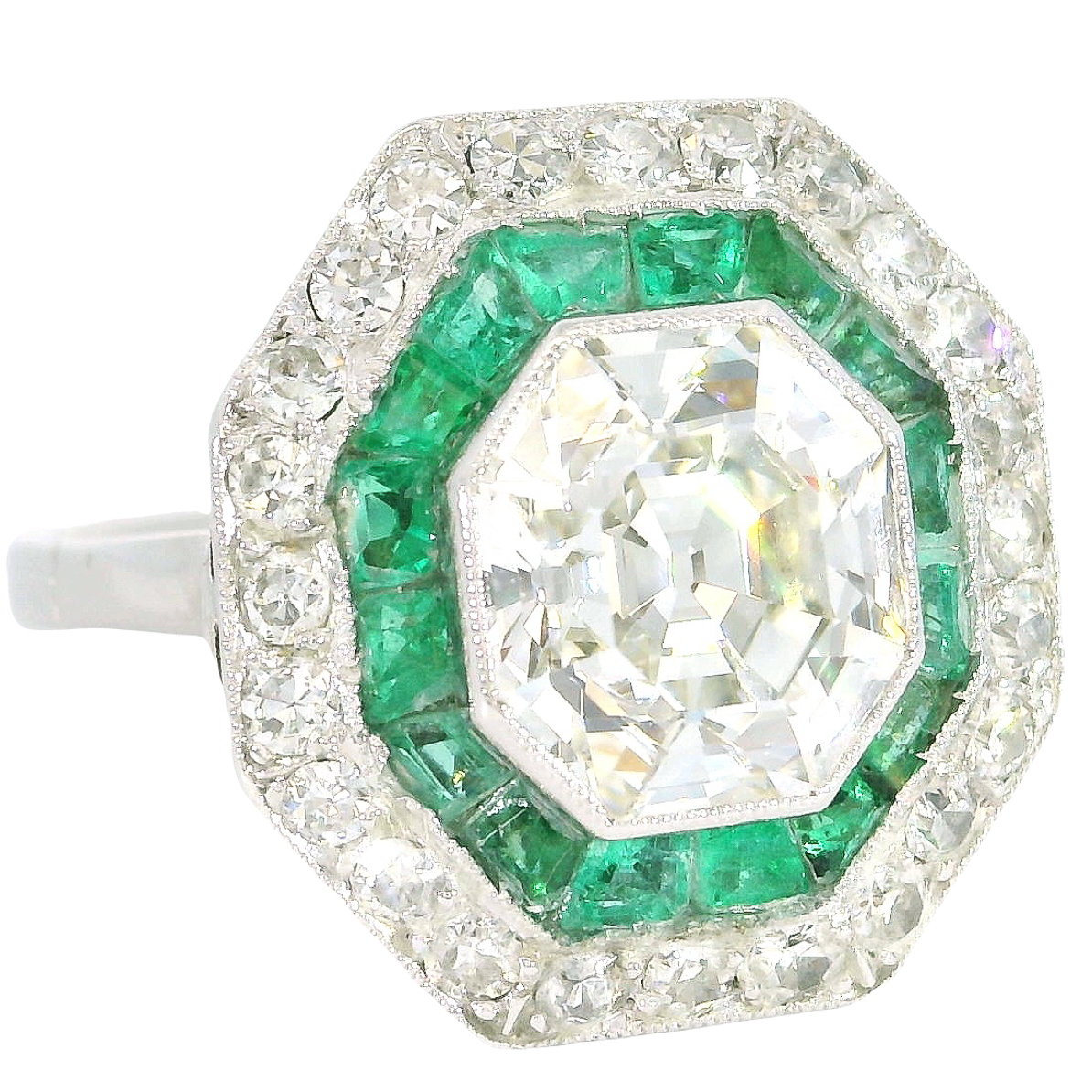 Art Deco ring Platinum 2.2 carat Asscher Cut VVS Emeralds Paris around 1925