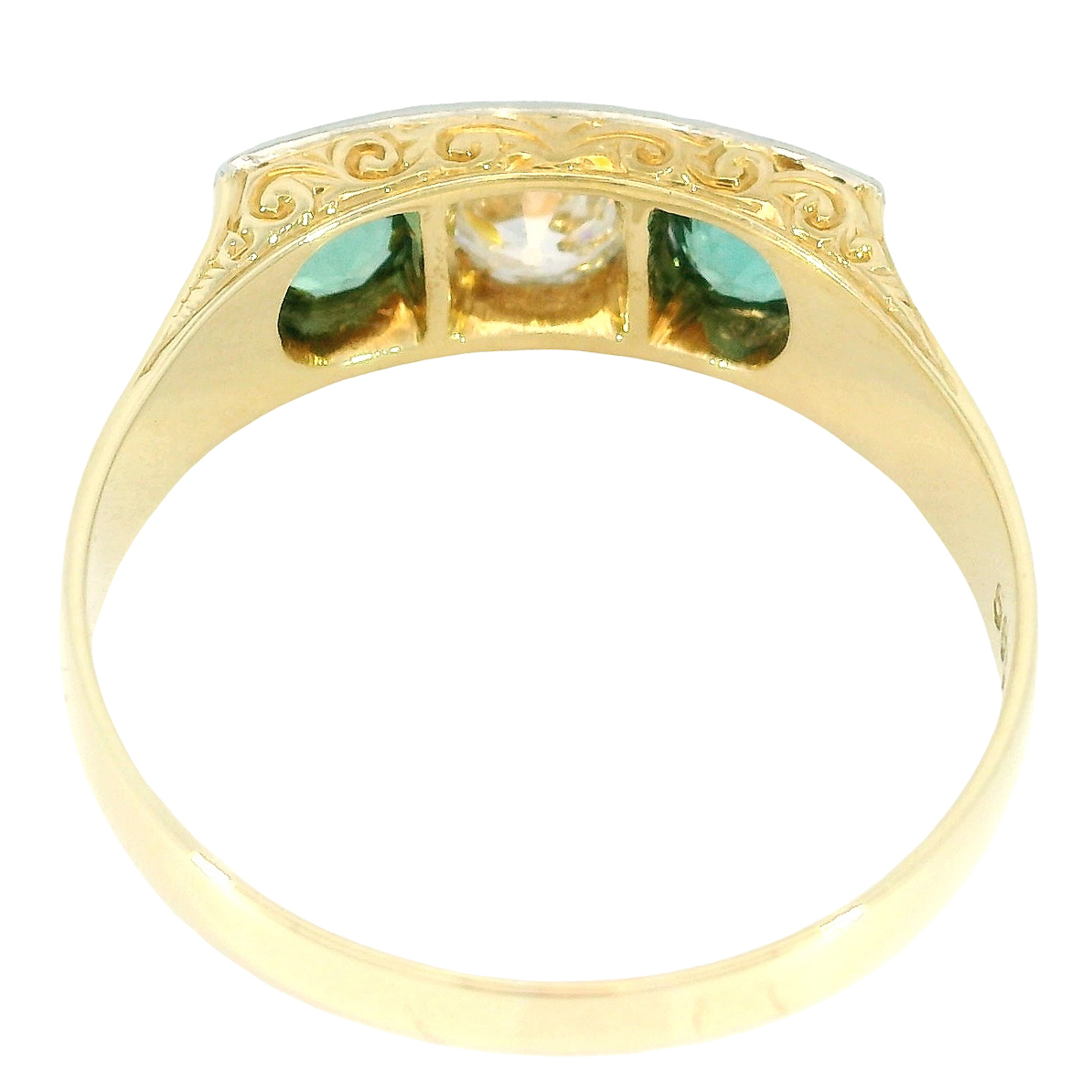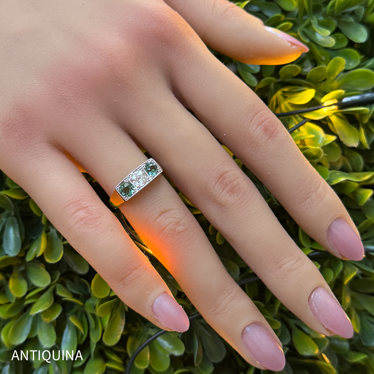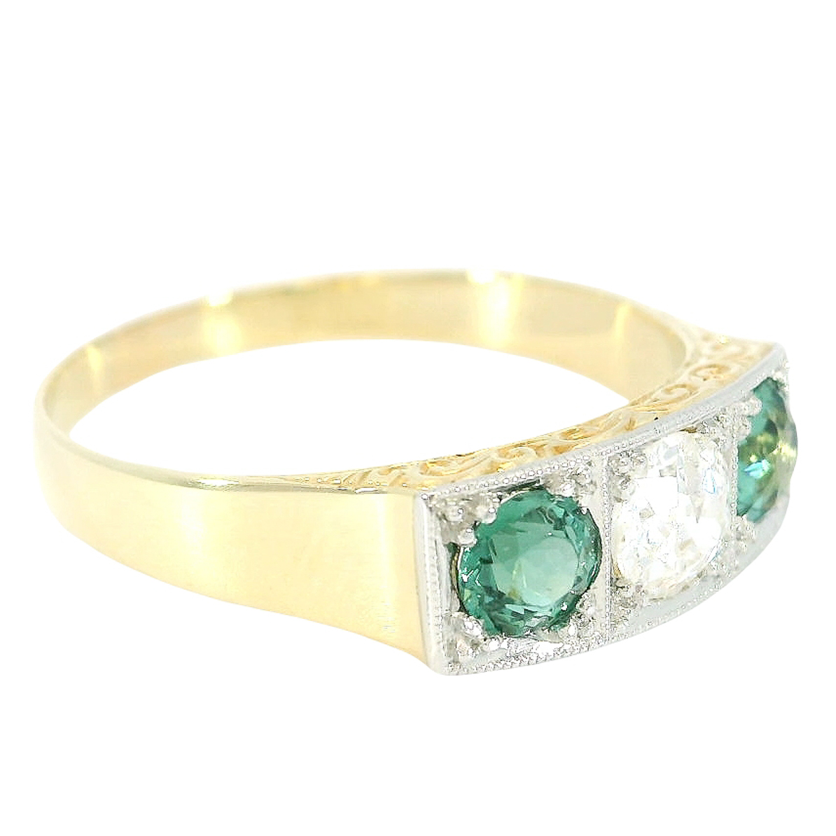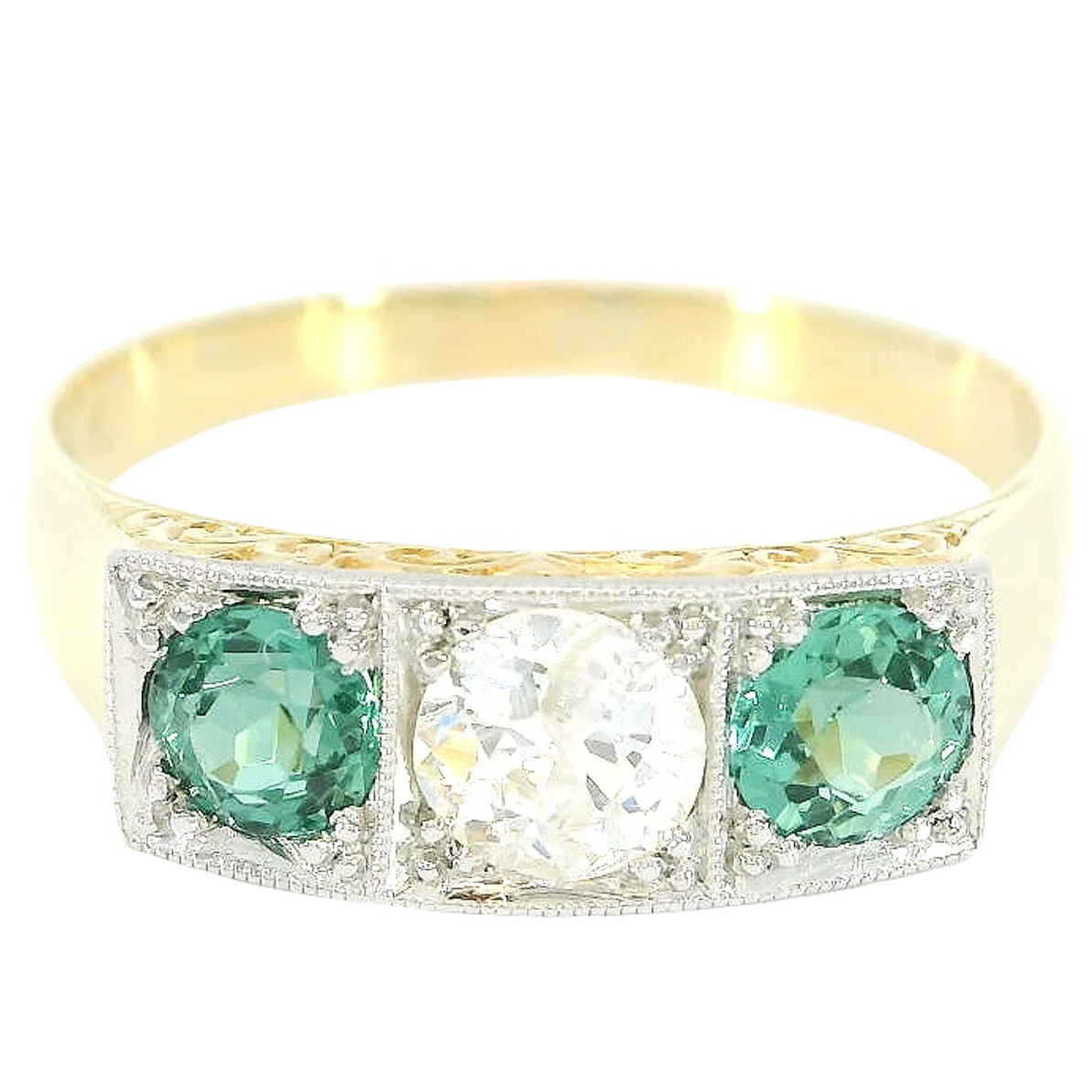 The diamond is flanked on either side by a green tourmaline, perfectly color-coordinated and of impressive vibrancy
