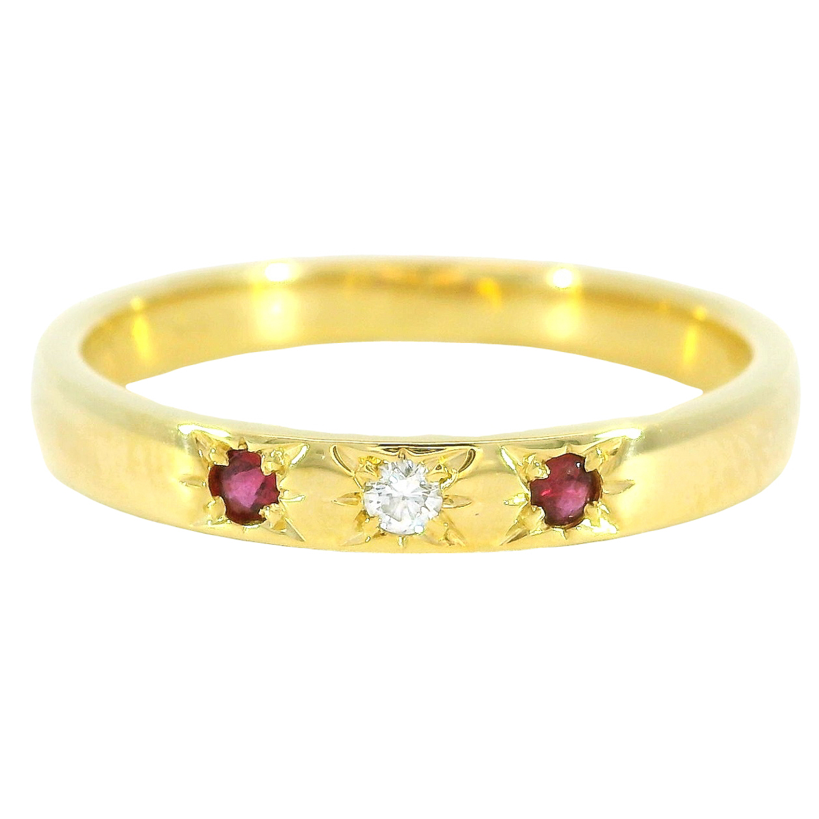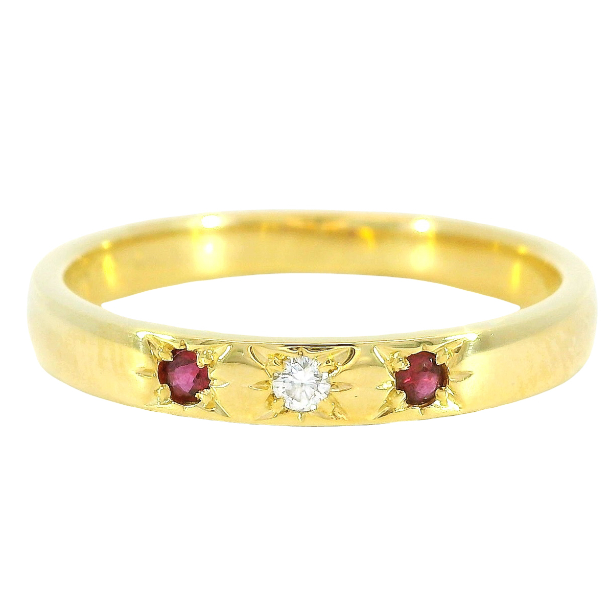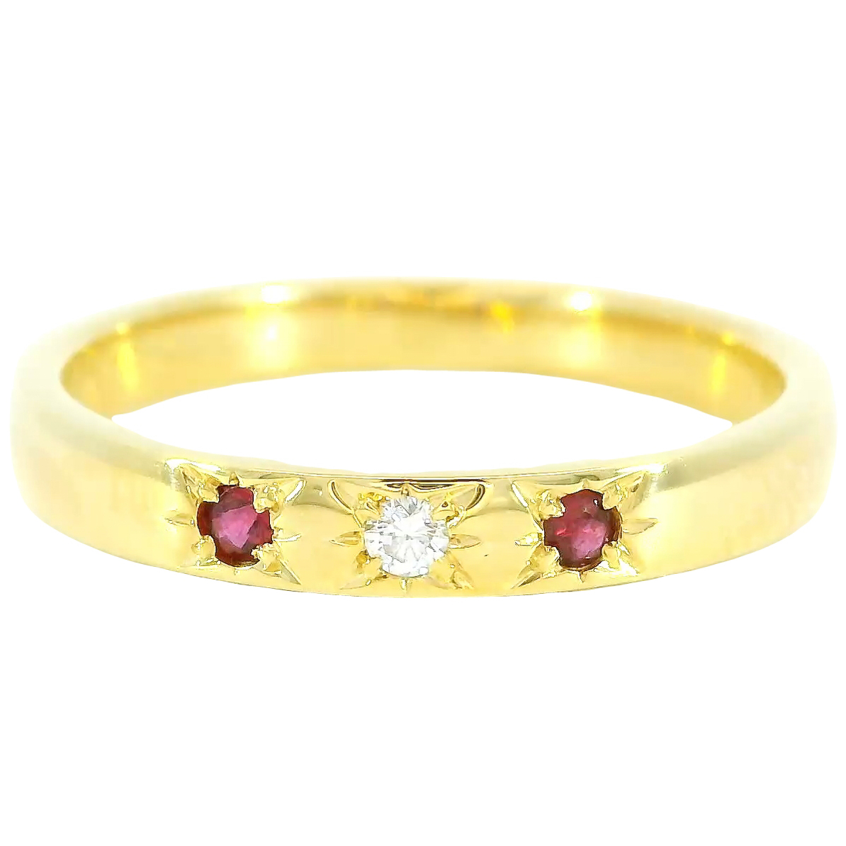 Wunderschöner massiver Bandring, gearbeitet in 18 Karat Gelbgold, besetzt mittig mit einem Diamantet und zwei Rubinen, sternförmig eingefasst,