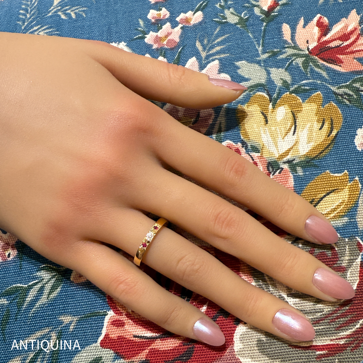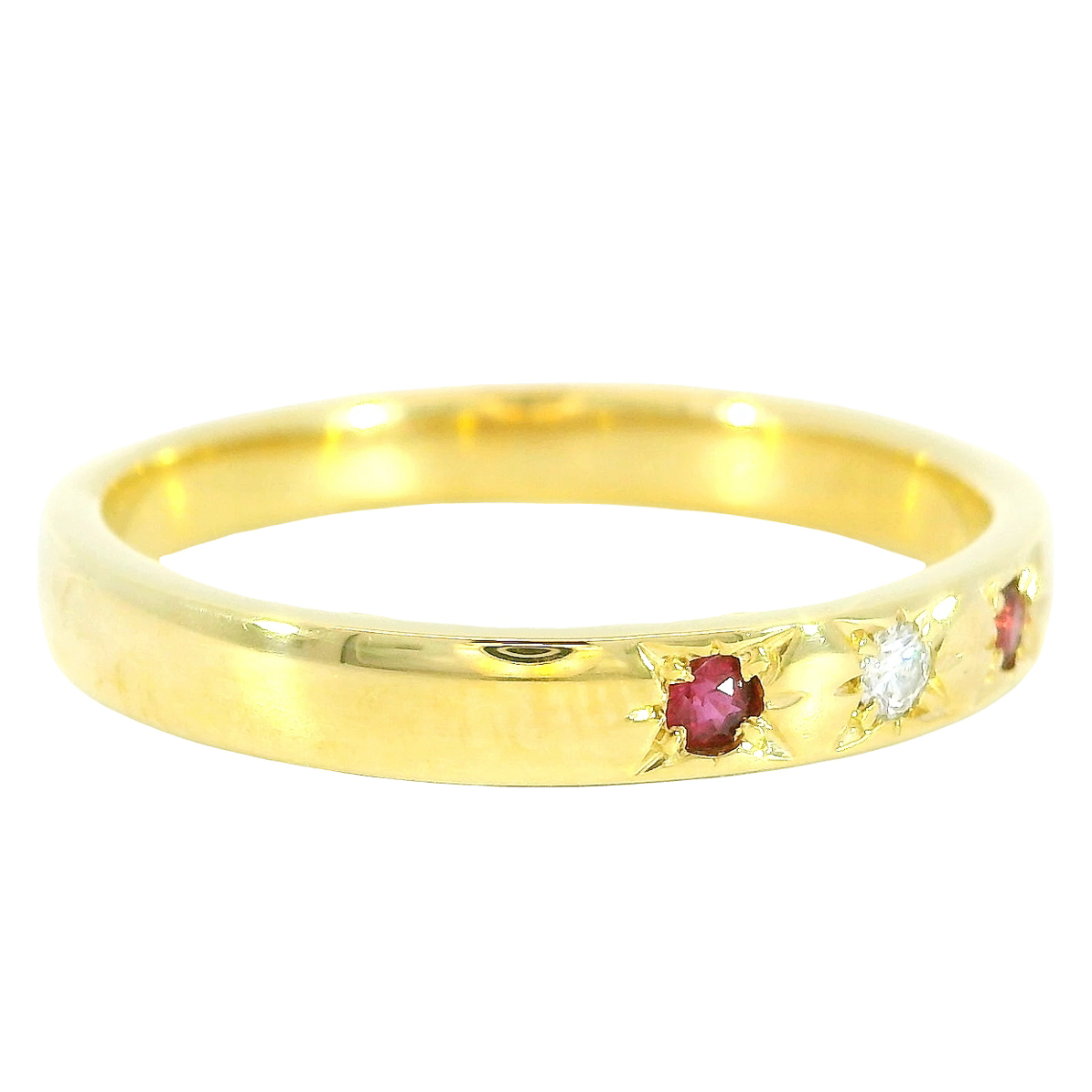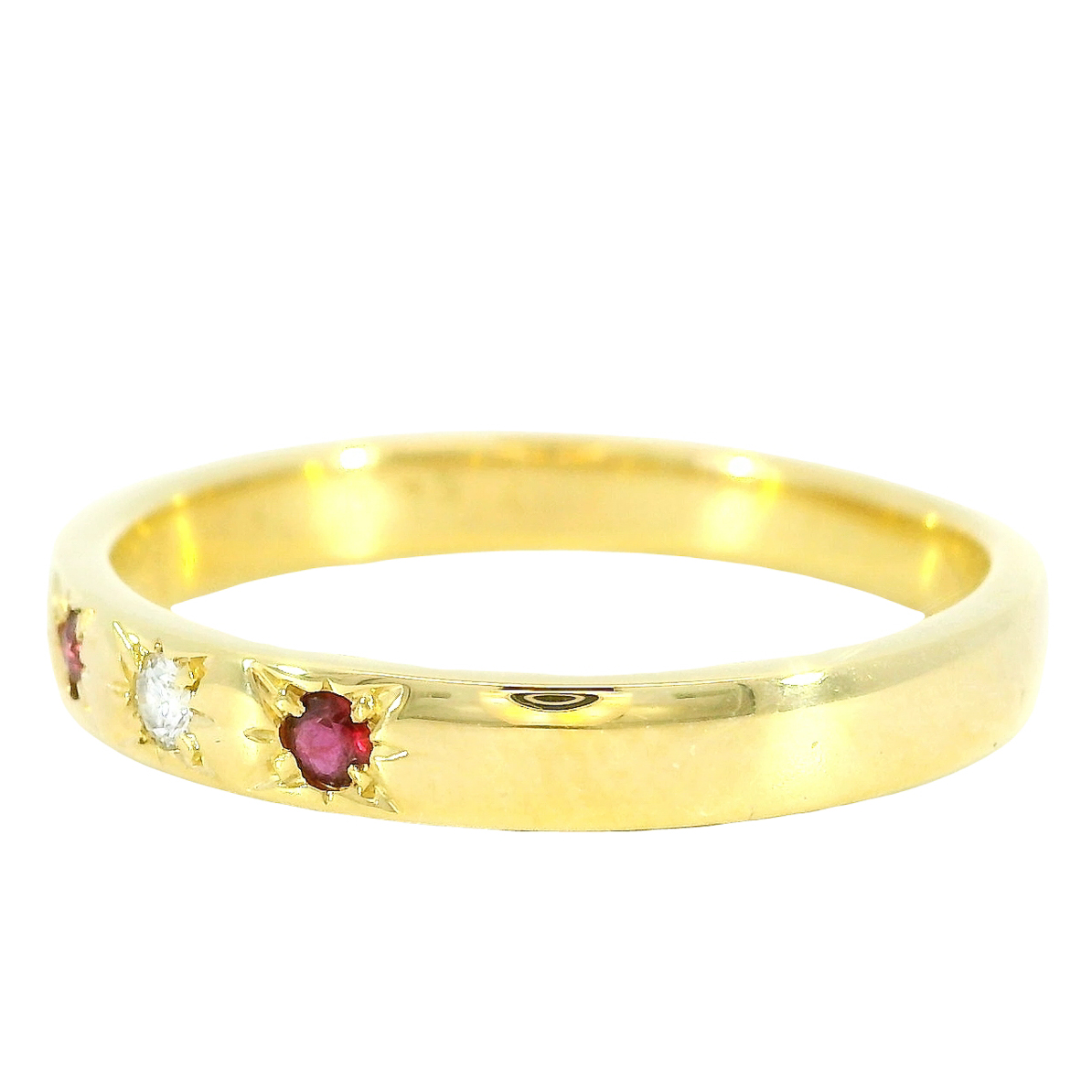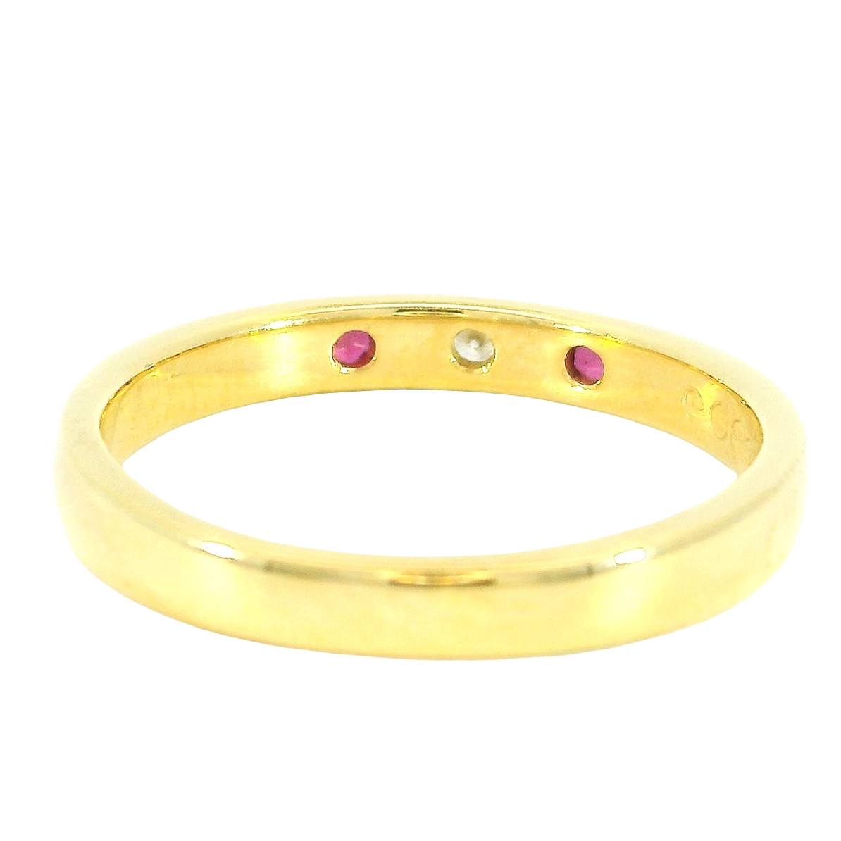 Wunderschöner massiver Bandring, gearbeitet in 18 Karat Gelbgold, besetzt mittig mit einem Diamantet und zwei Rubinen, sternförmig eingefasst,