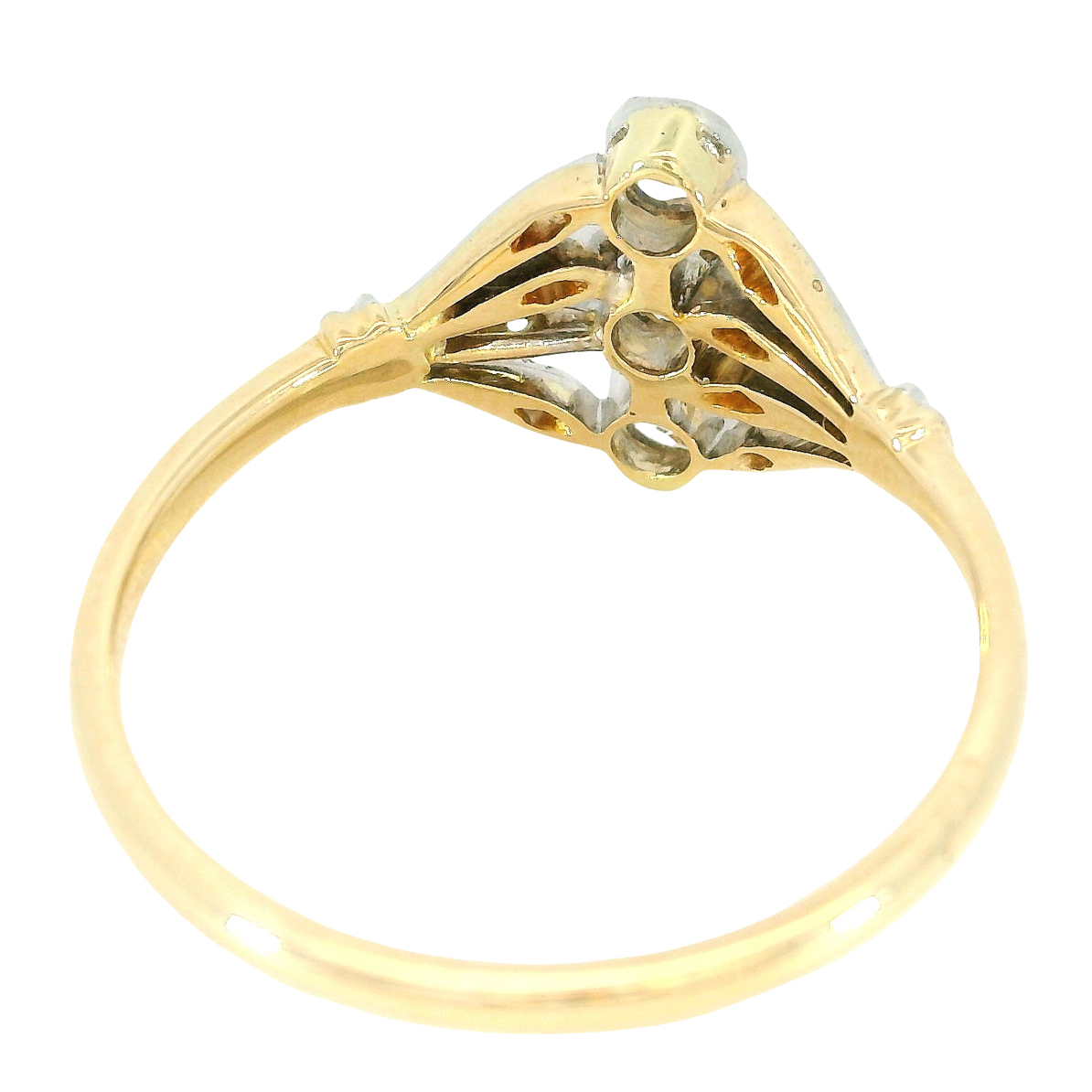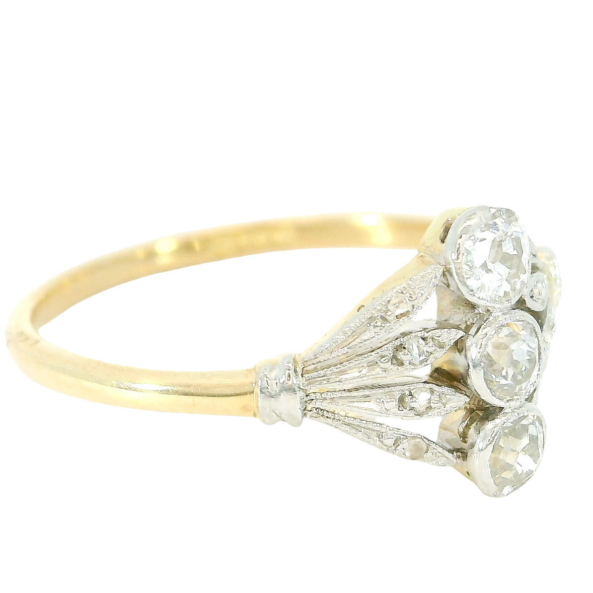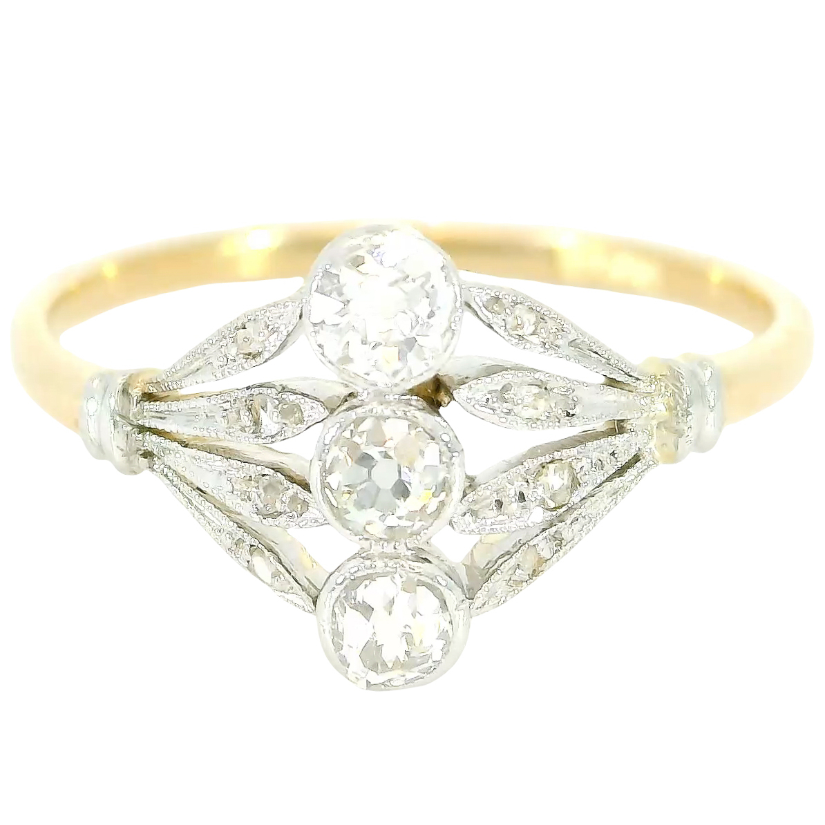 früher Art Deco Ring 14 Karat Gelbgold Platin Diamanttrio stilisierte Knospe um 1910/15