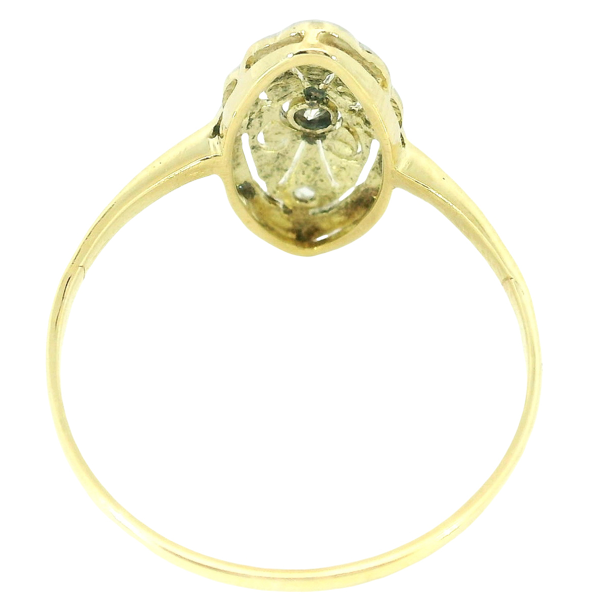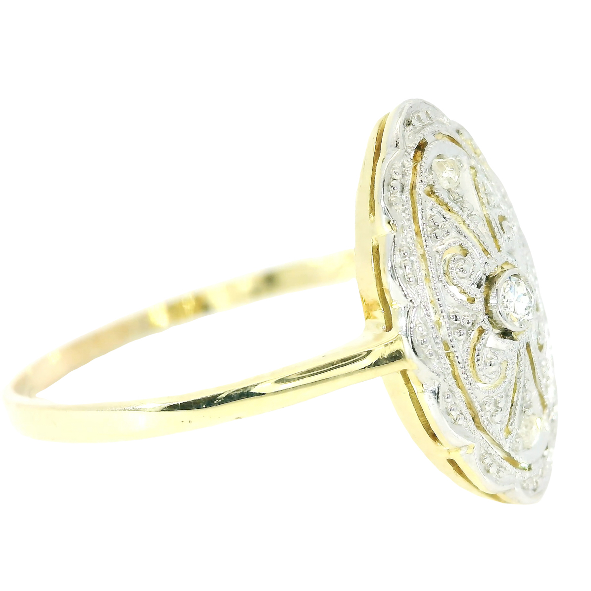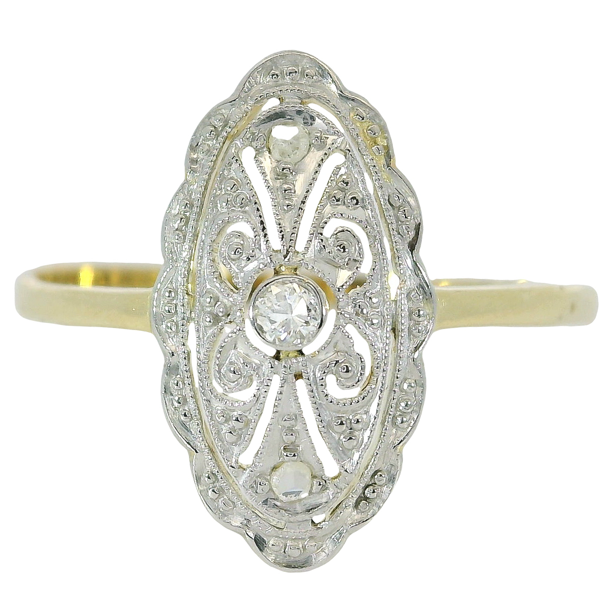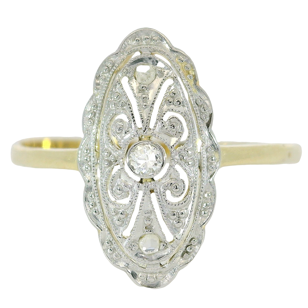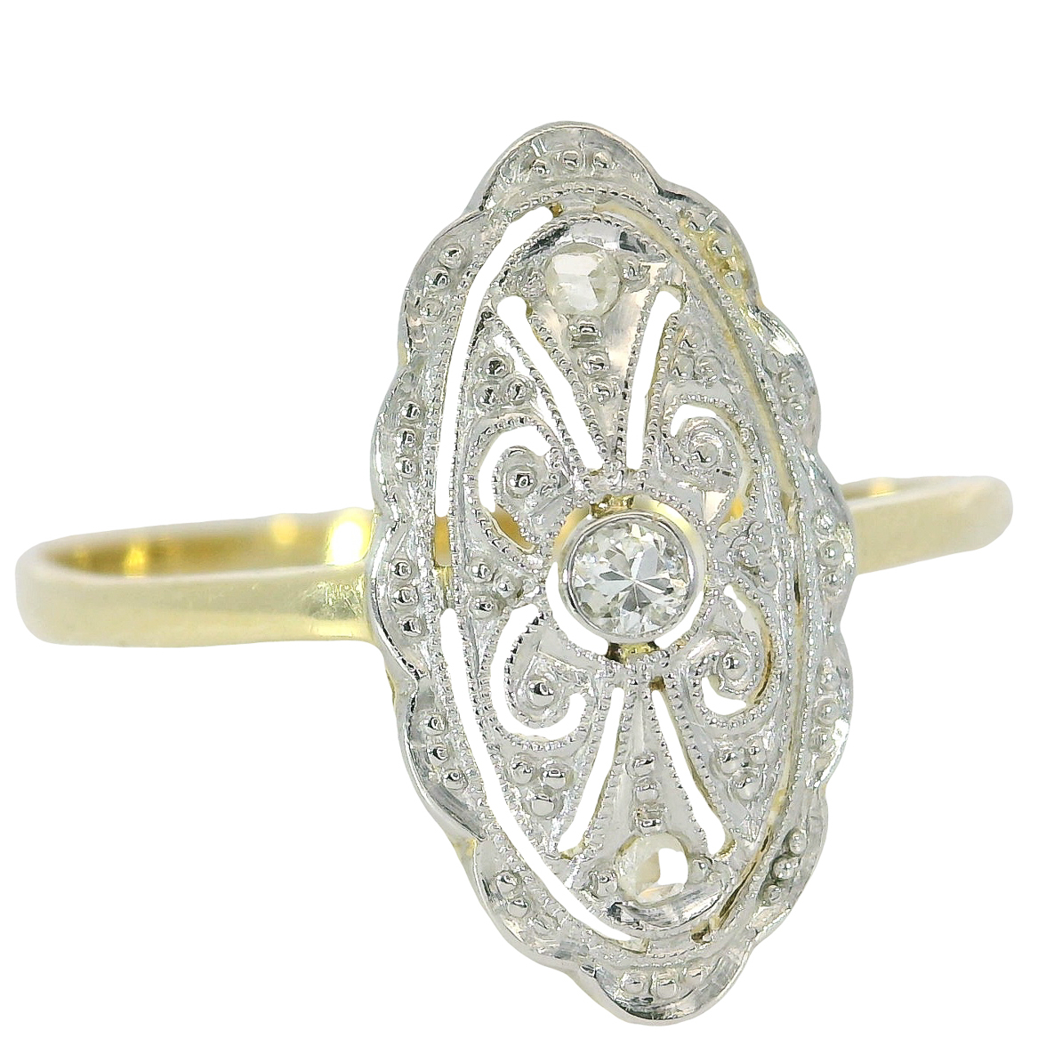 Antiker zarter Art Deco Ring um 1920, Schiffchenring gearbeitet in 14 Karat Gelbgold, flache Schiffchenform, platinierter Ringkopf,