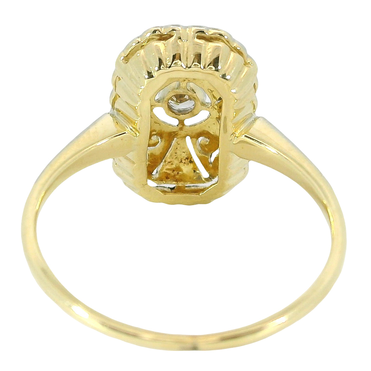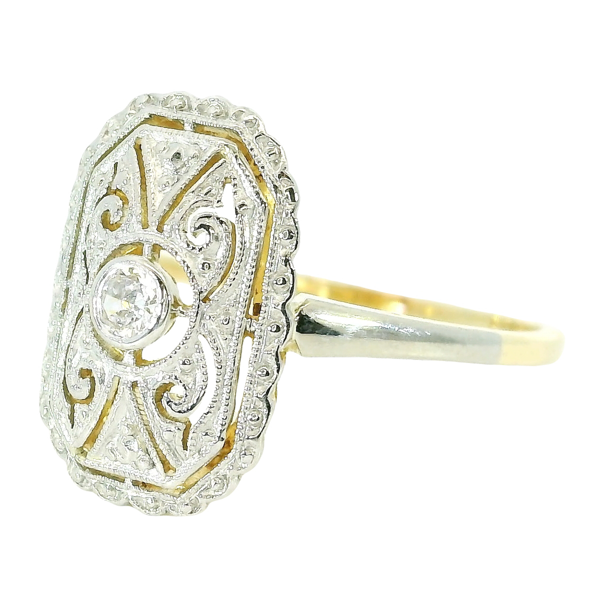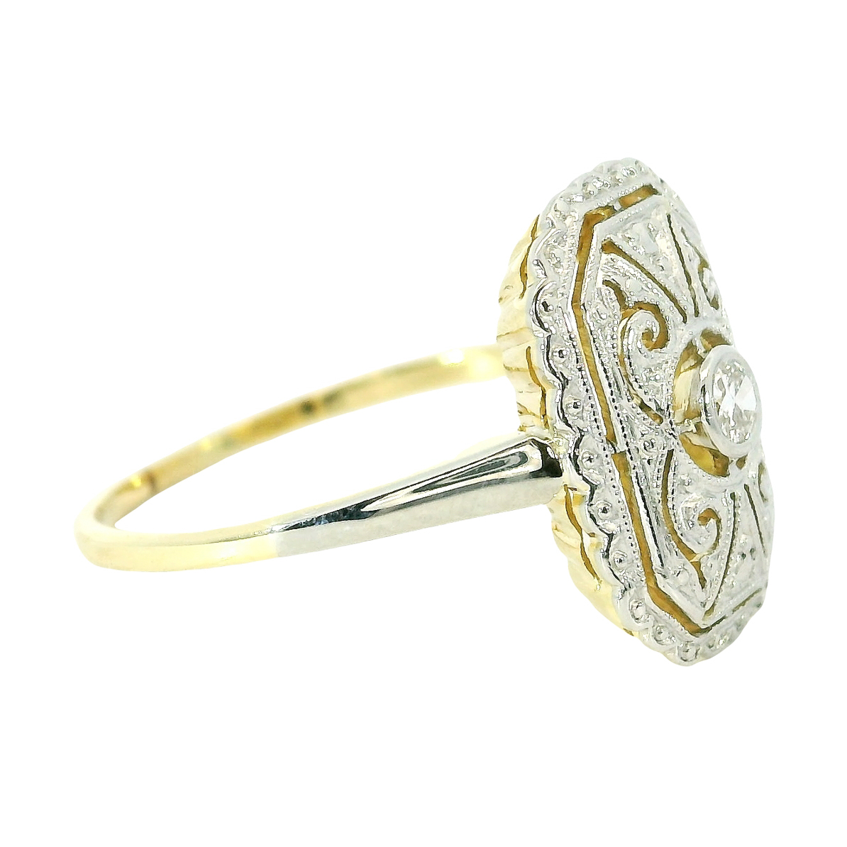 Antiker zarter Art Deco Ring um 1920, flache Schildform gearbeitet in 14 Karat Gelbgold, platinierter Ringkopf oktagonal gestaltet,