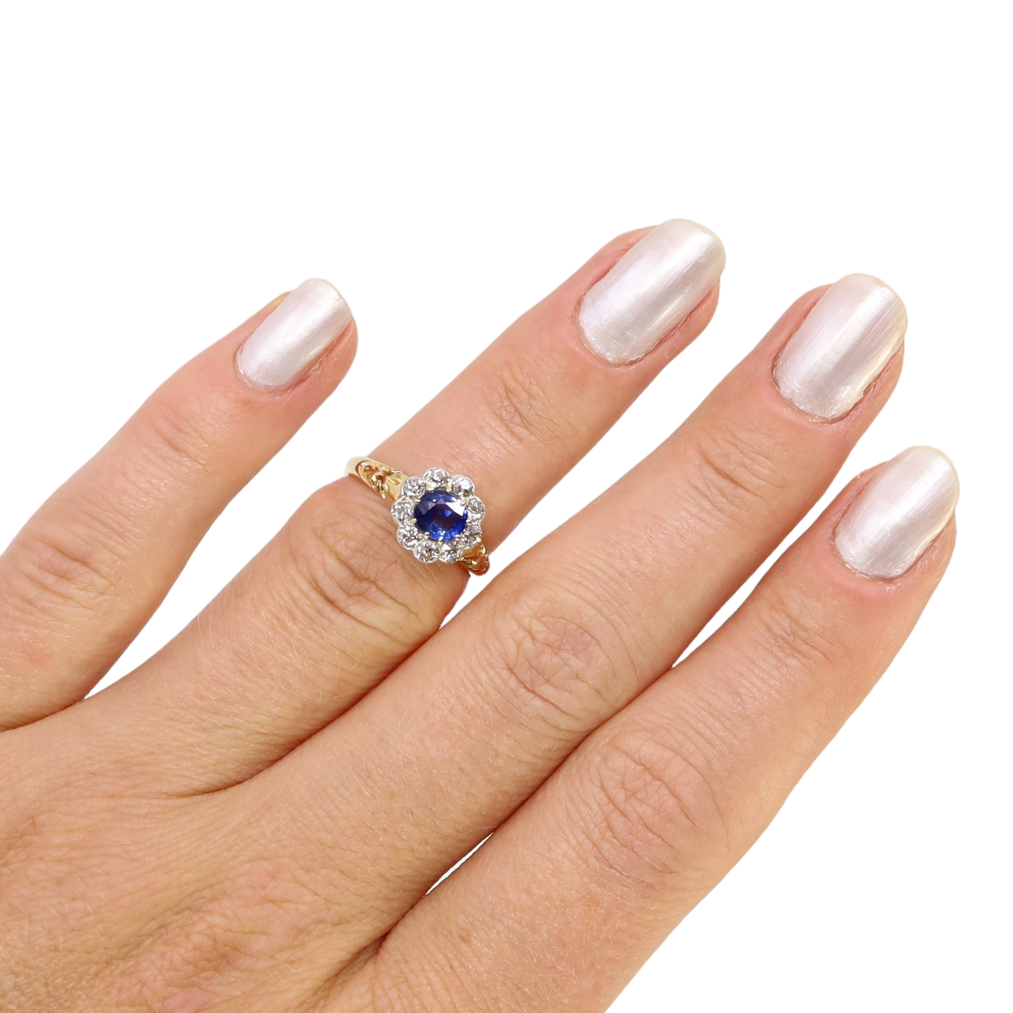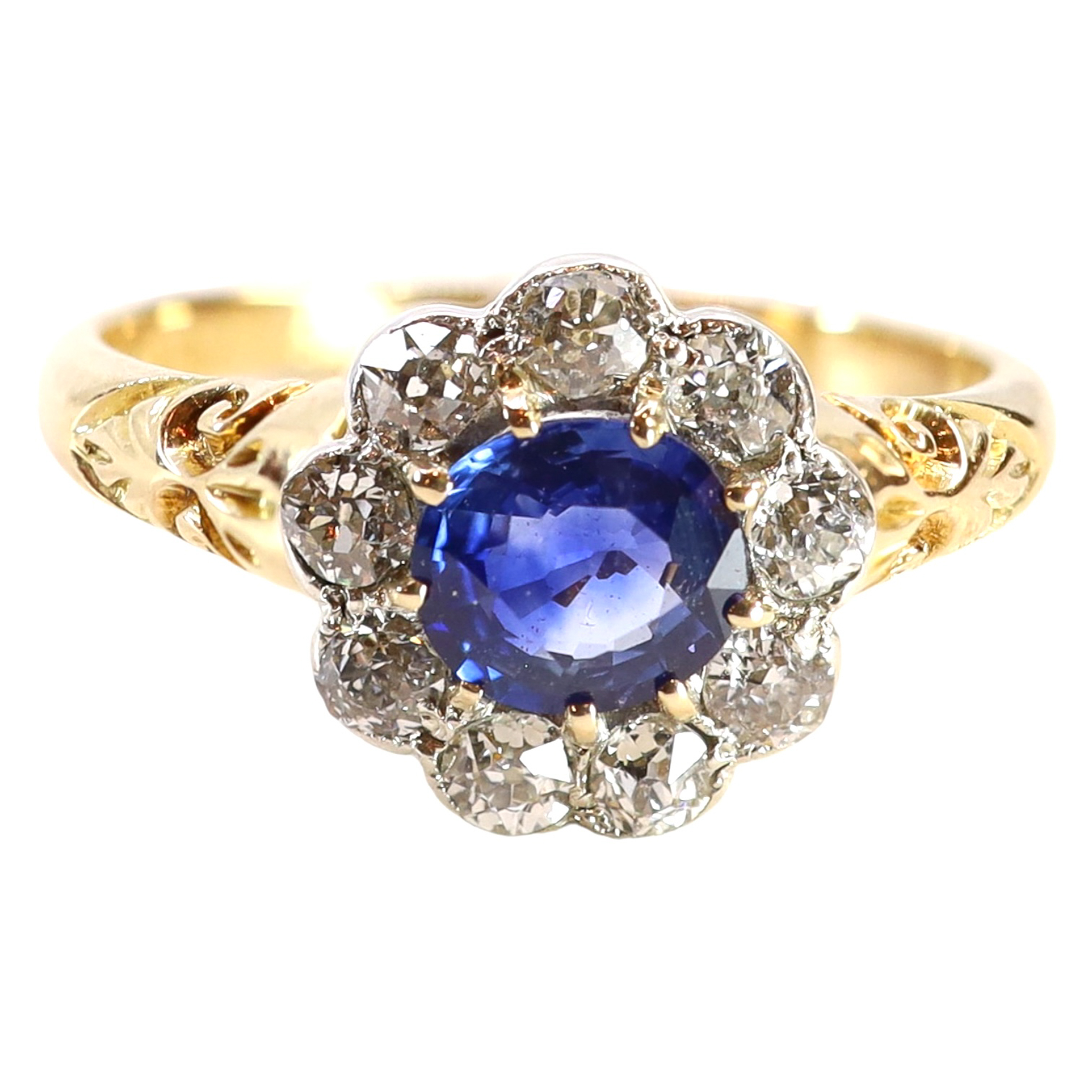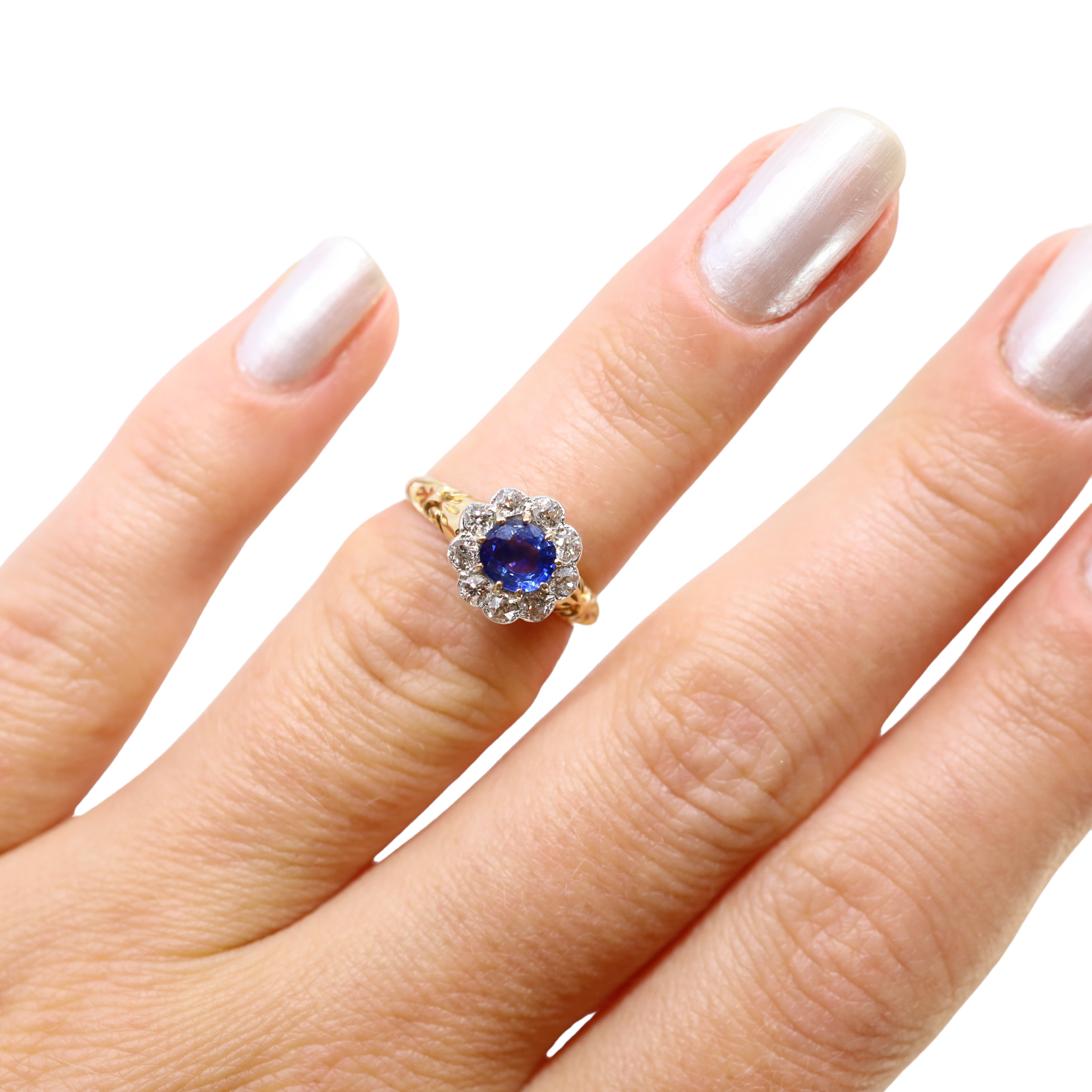 Ring head designed as a flower, center set with a cornflower blue large sapphire, faceted,