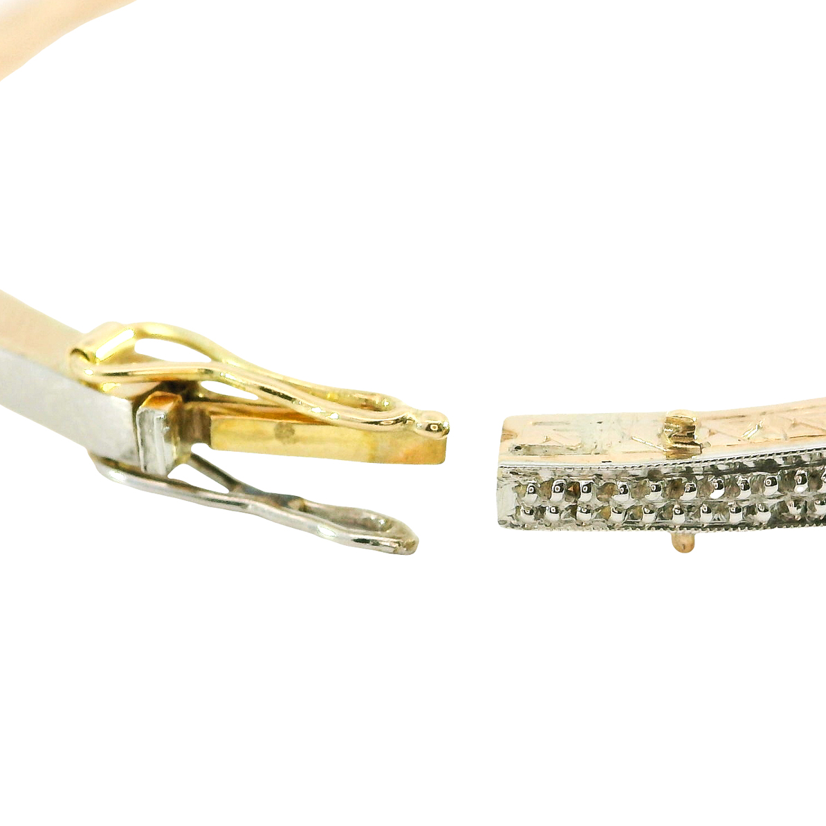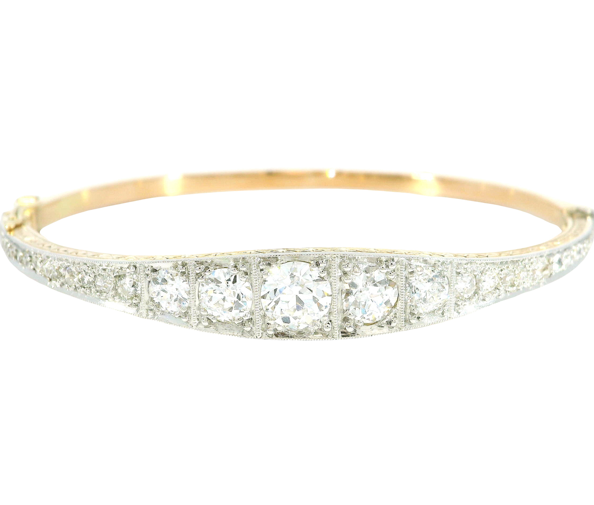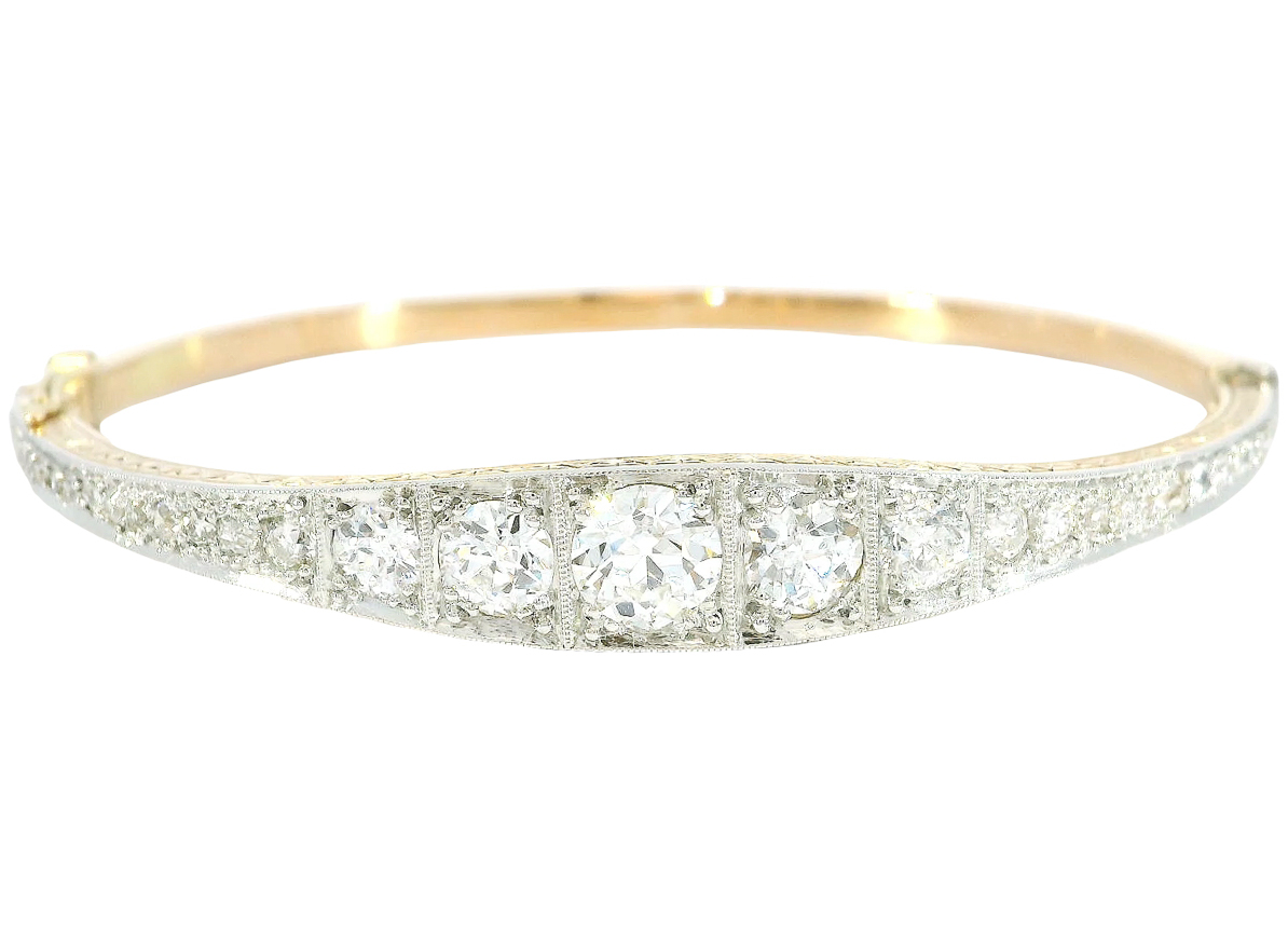 The antique Art Deco bangle is crafted in 18 carat yellow gold and the front is finished with platinum, typical of the time,