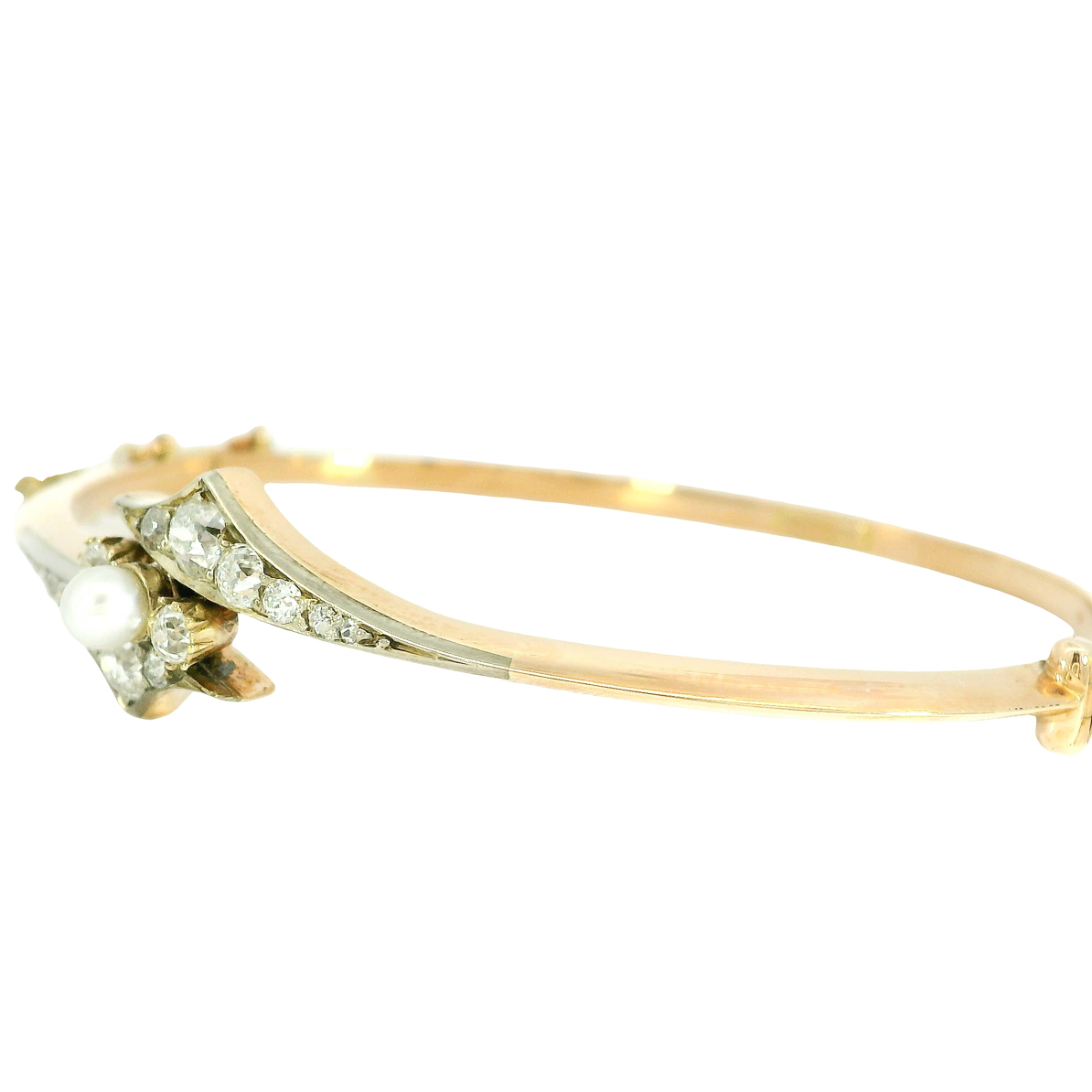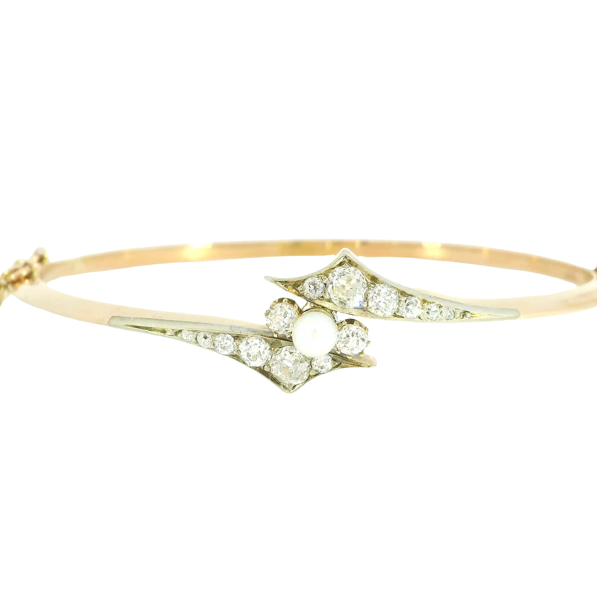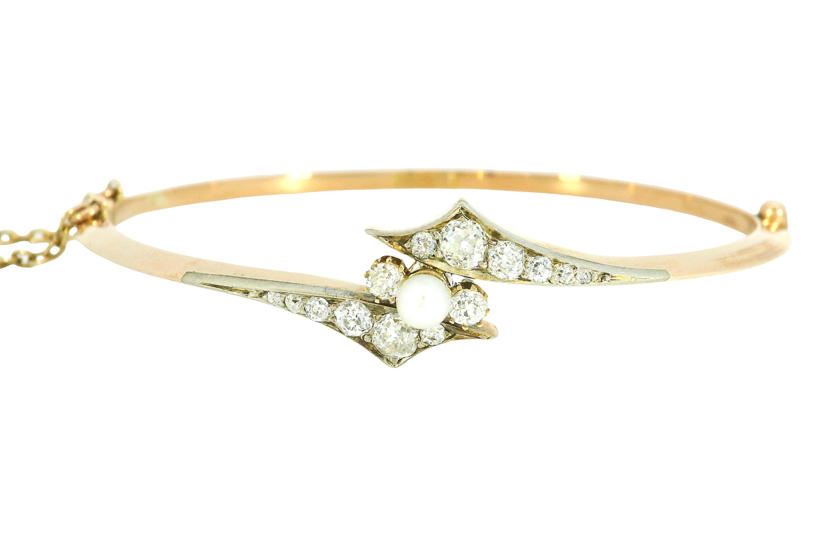 Seltener, schmaler und antiker Armreif, frühes Art Deco, 14 Karat Gold, Diamanten & Perle um 1910/15,