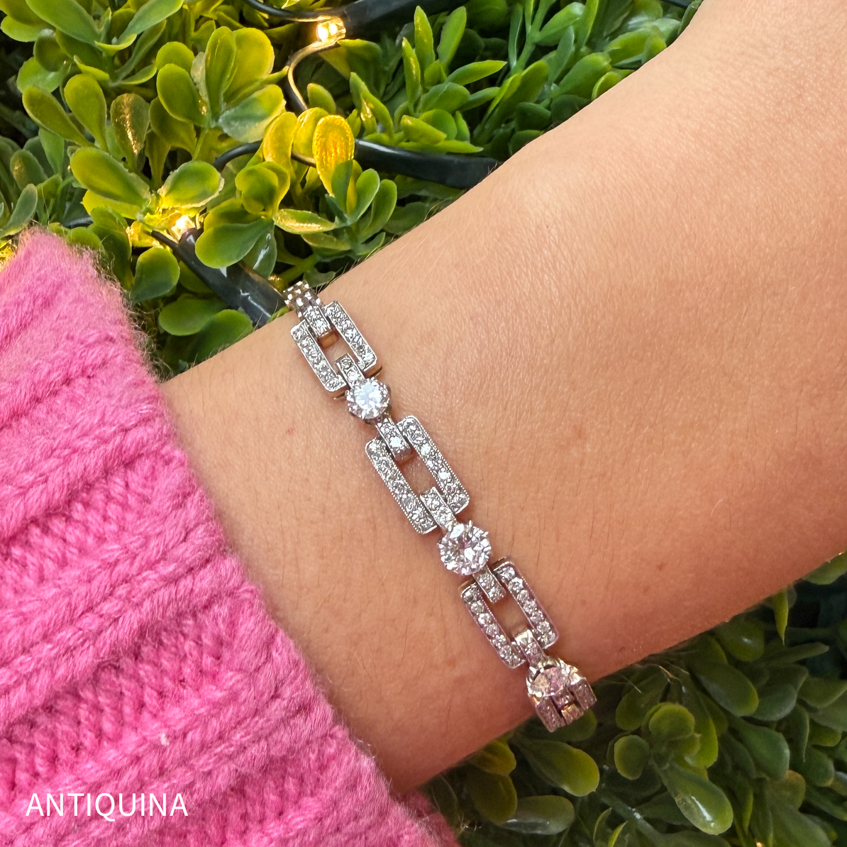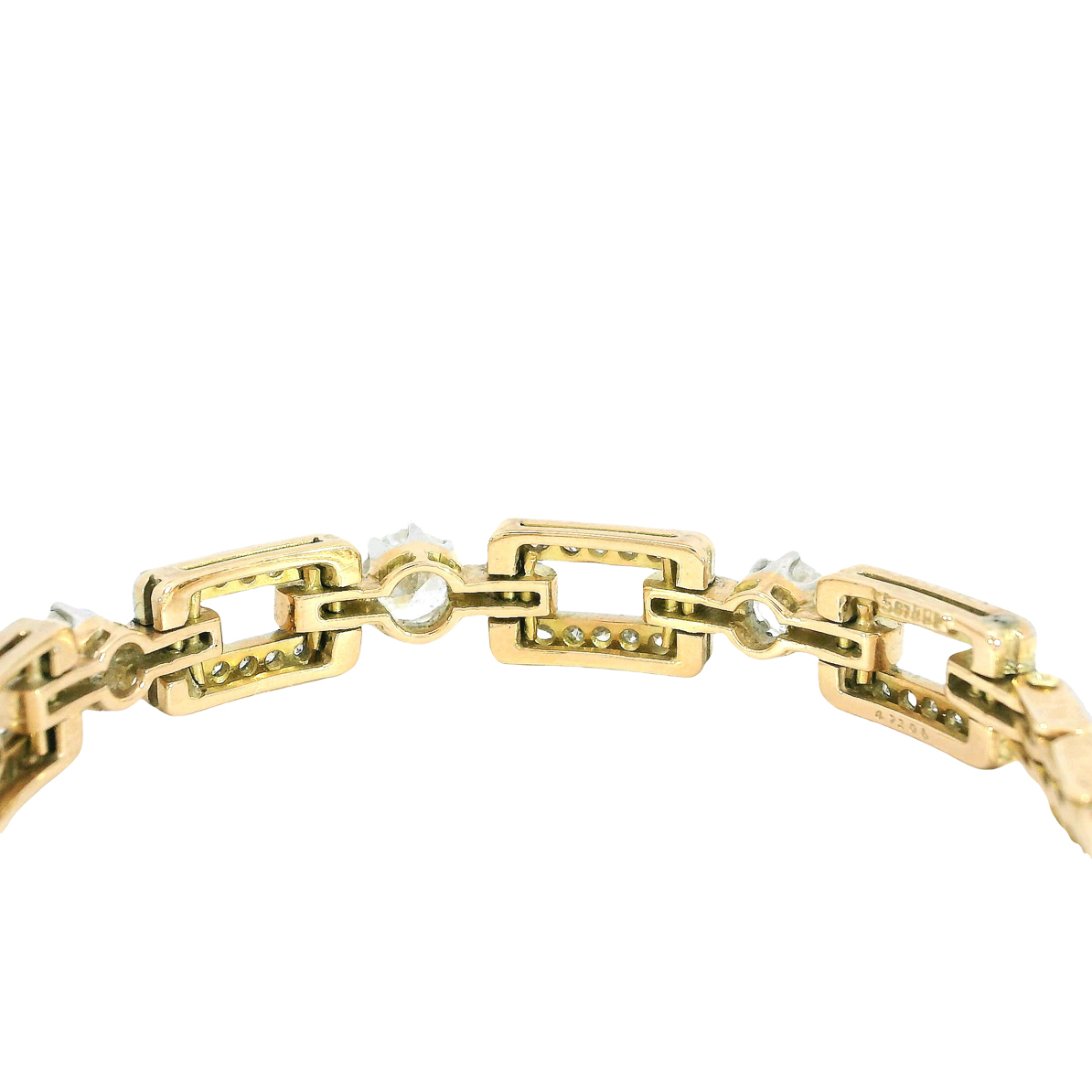 rectangular links with open surfaces alternate with round, centrally set diamonds,