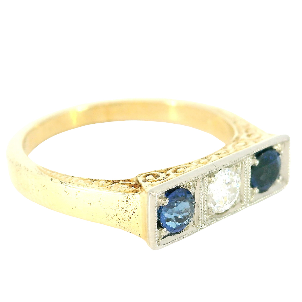 Antiker Art Deco Ring 14 Karat Gelbgold Diamant blaue Saphire Ziselierenden um 1920