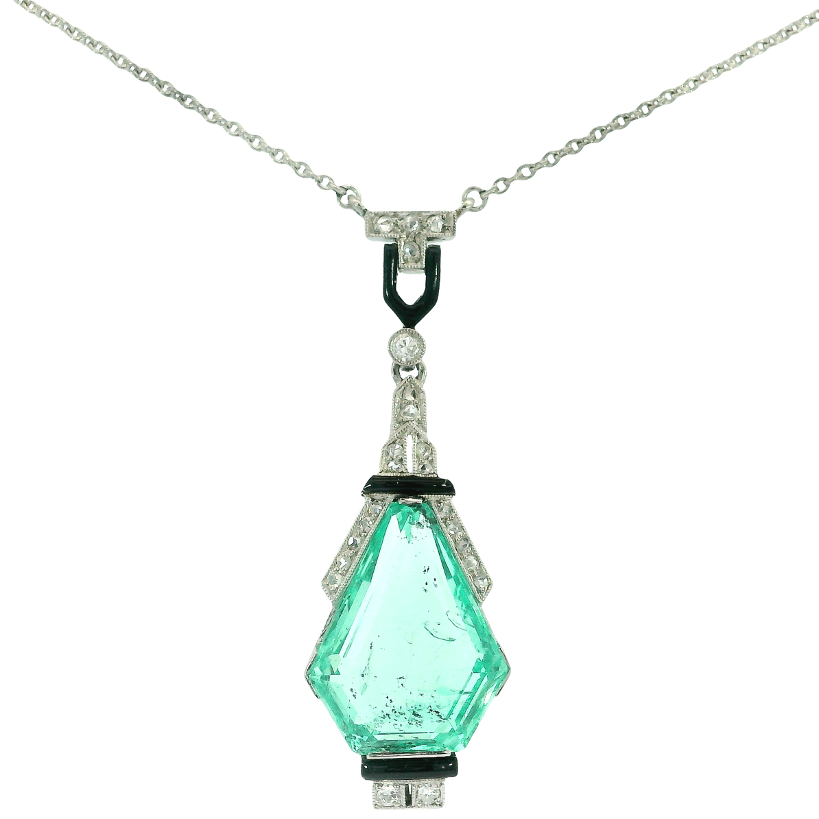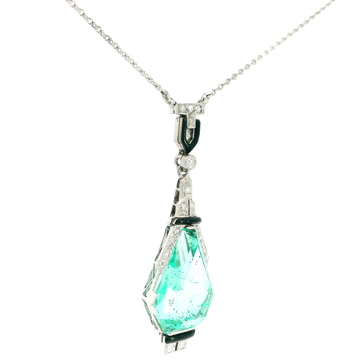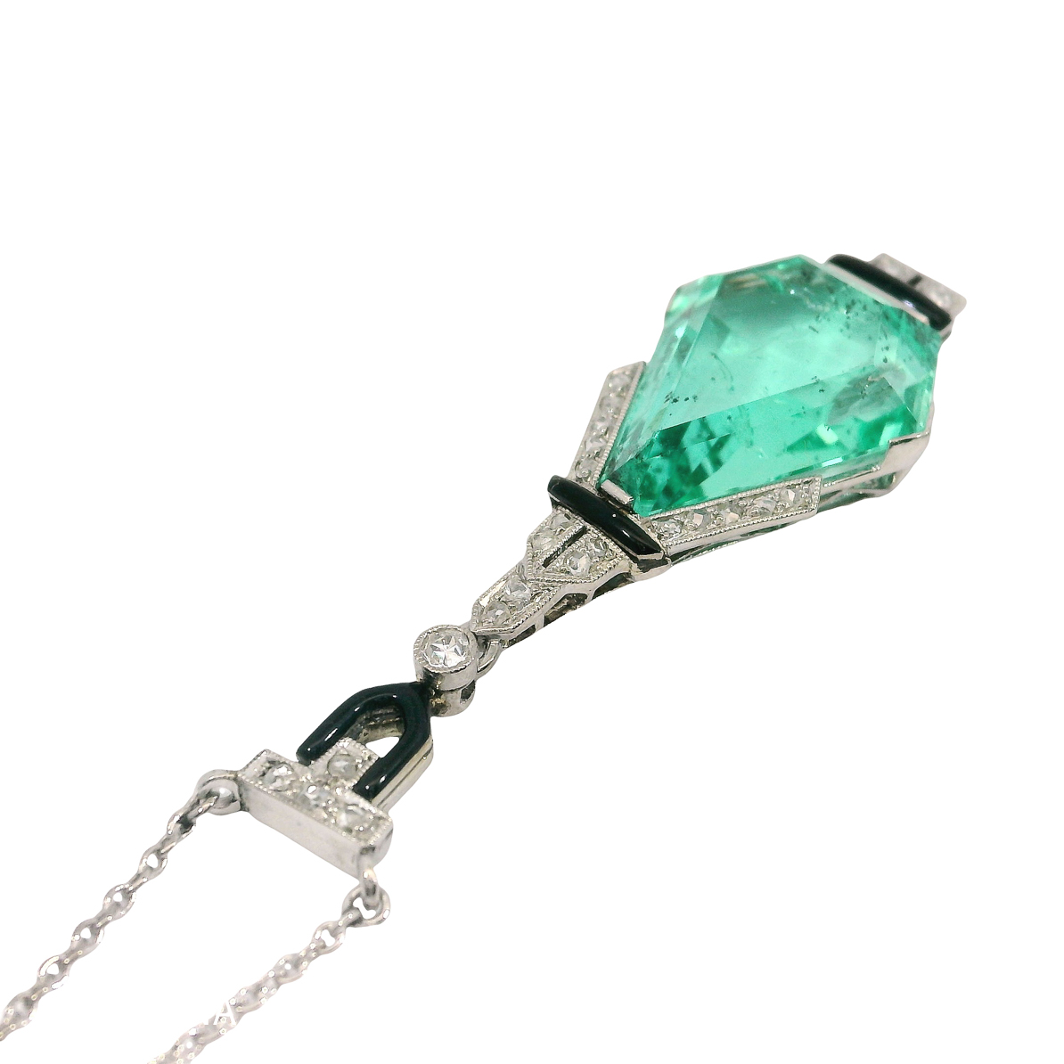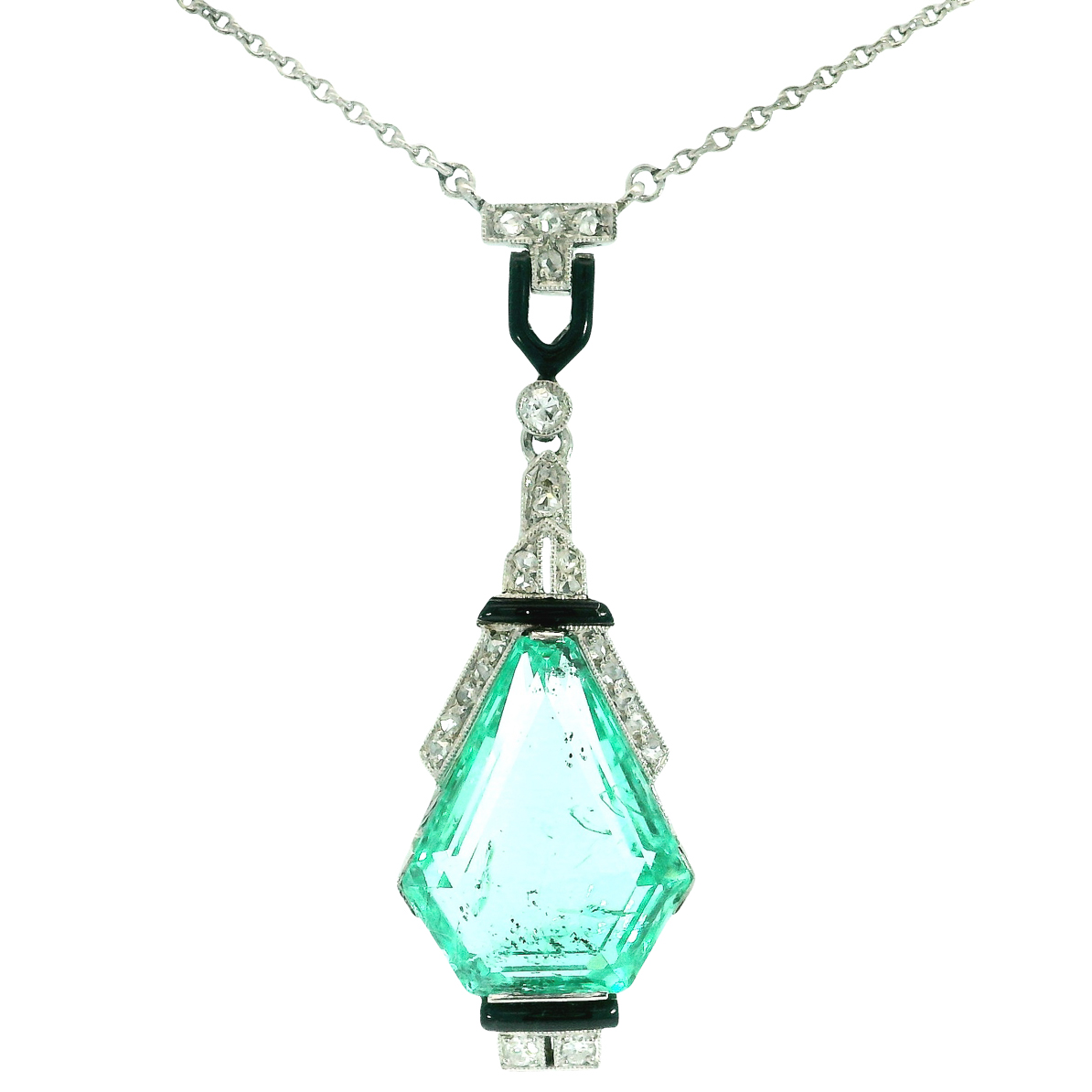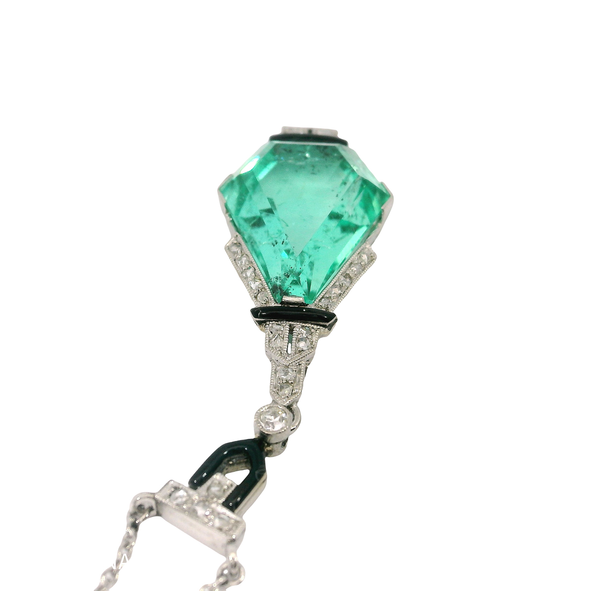 Original Art Deco necklace from around 1925 in 750 white gold with a large fantasy-cut emerald, onyx and diamonds: