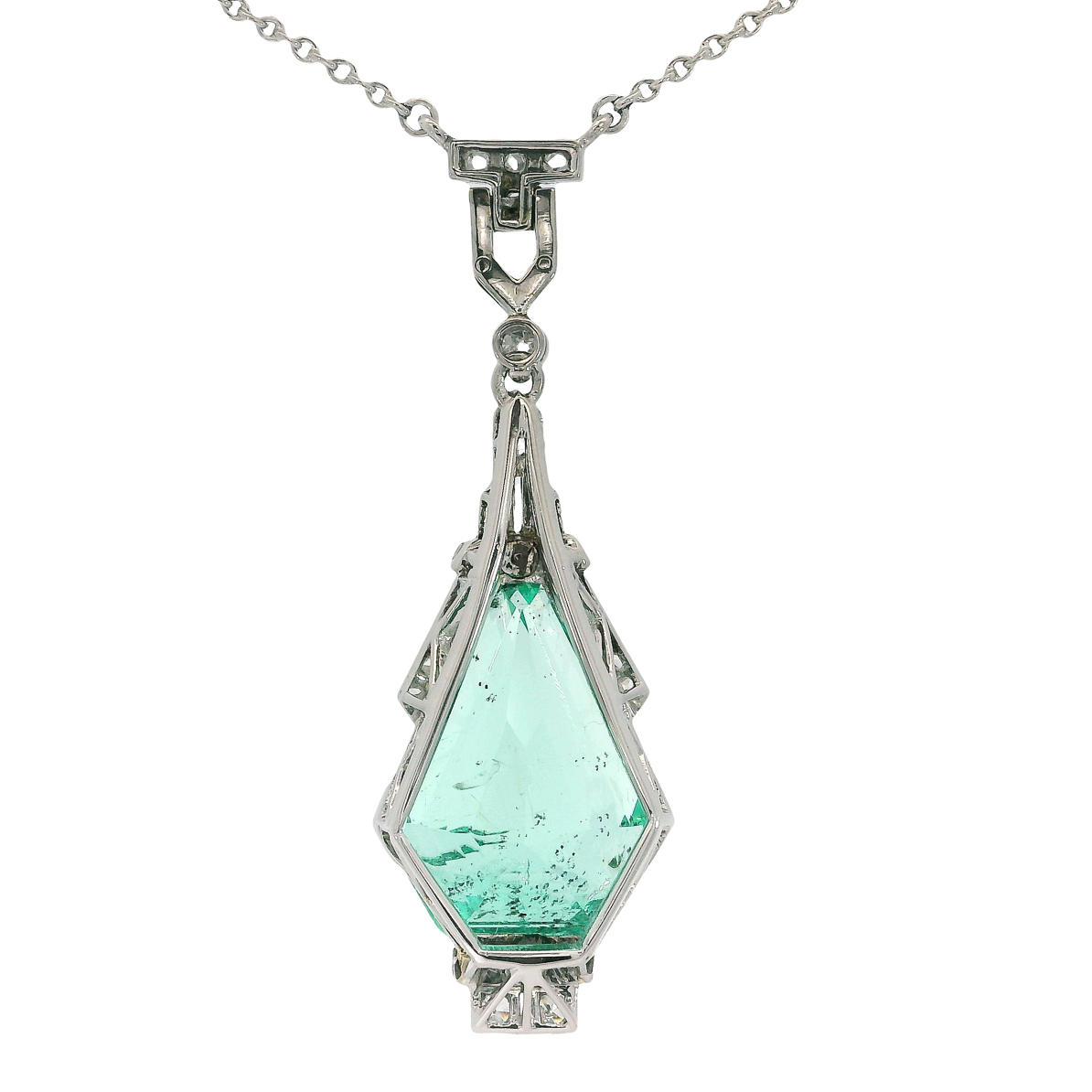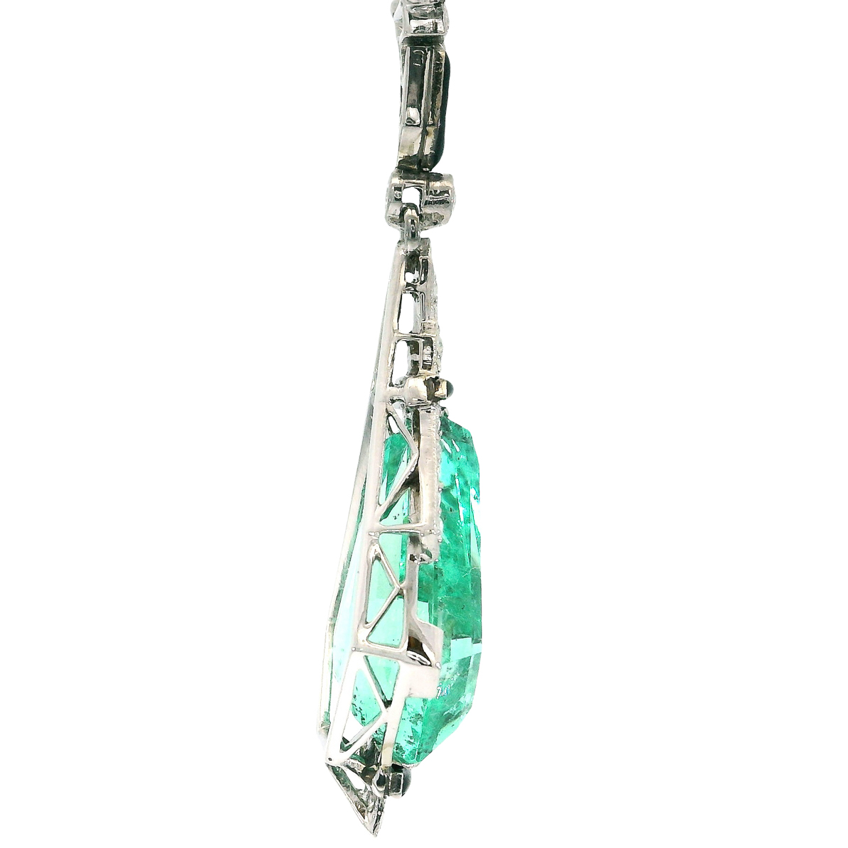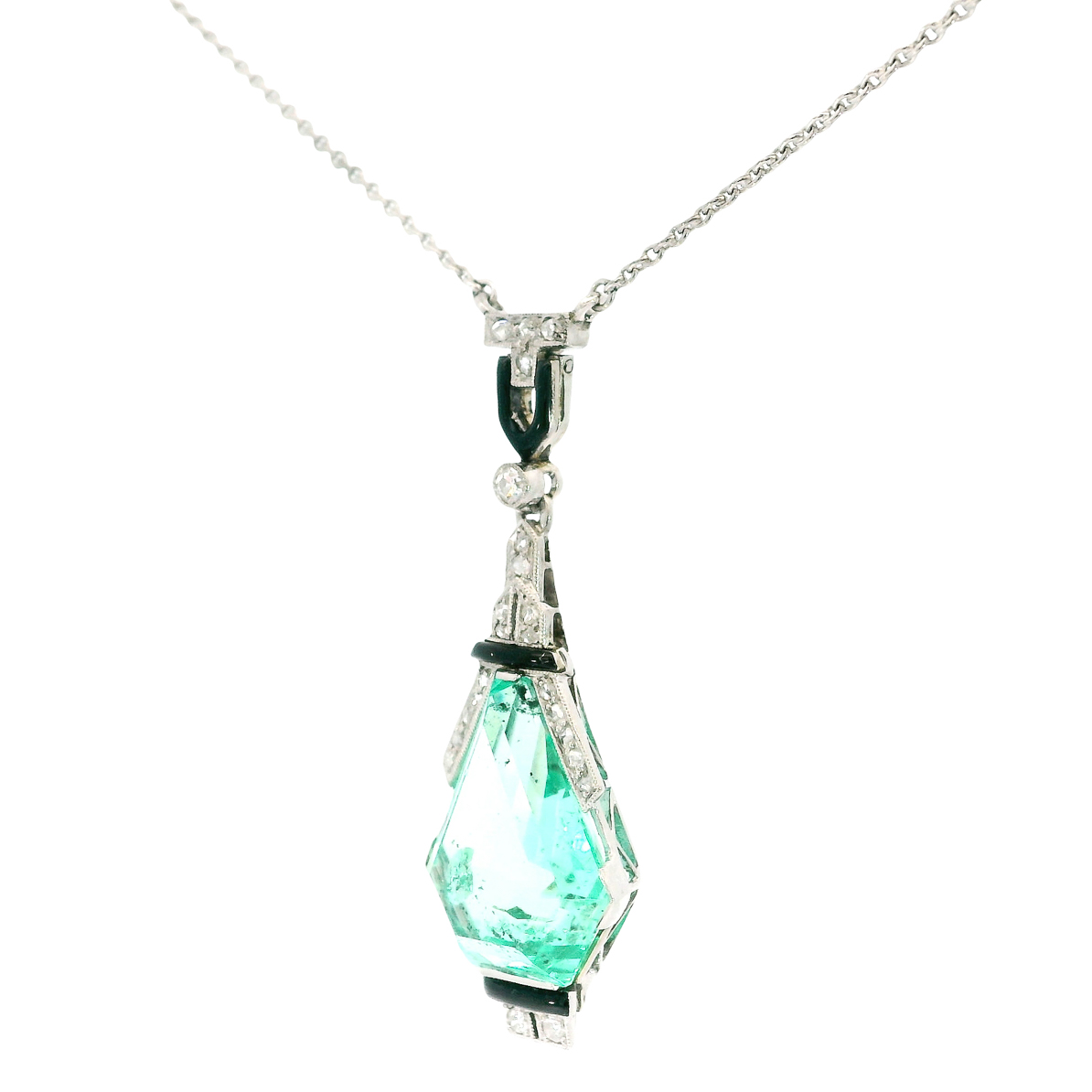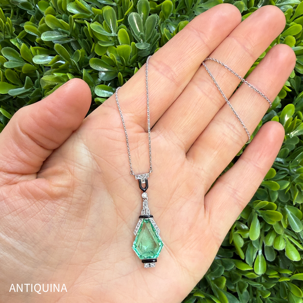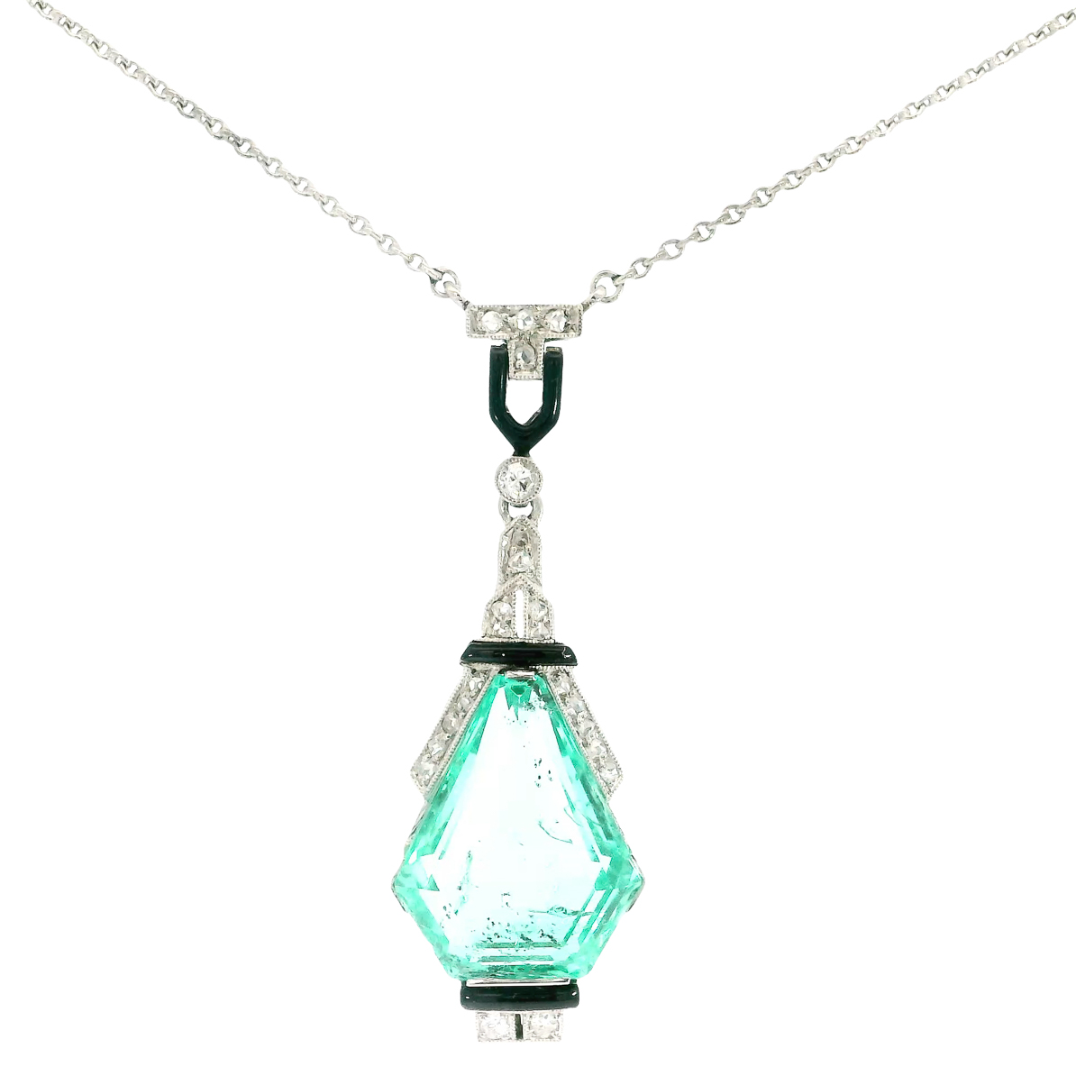Original Art Deco necklace from around 1925 in 750 white gold with a large fantasy-cut emerald, onyx and diamonds:
