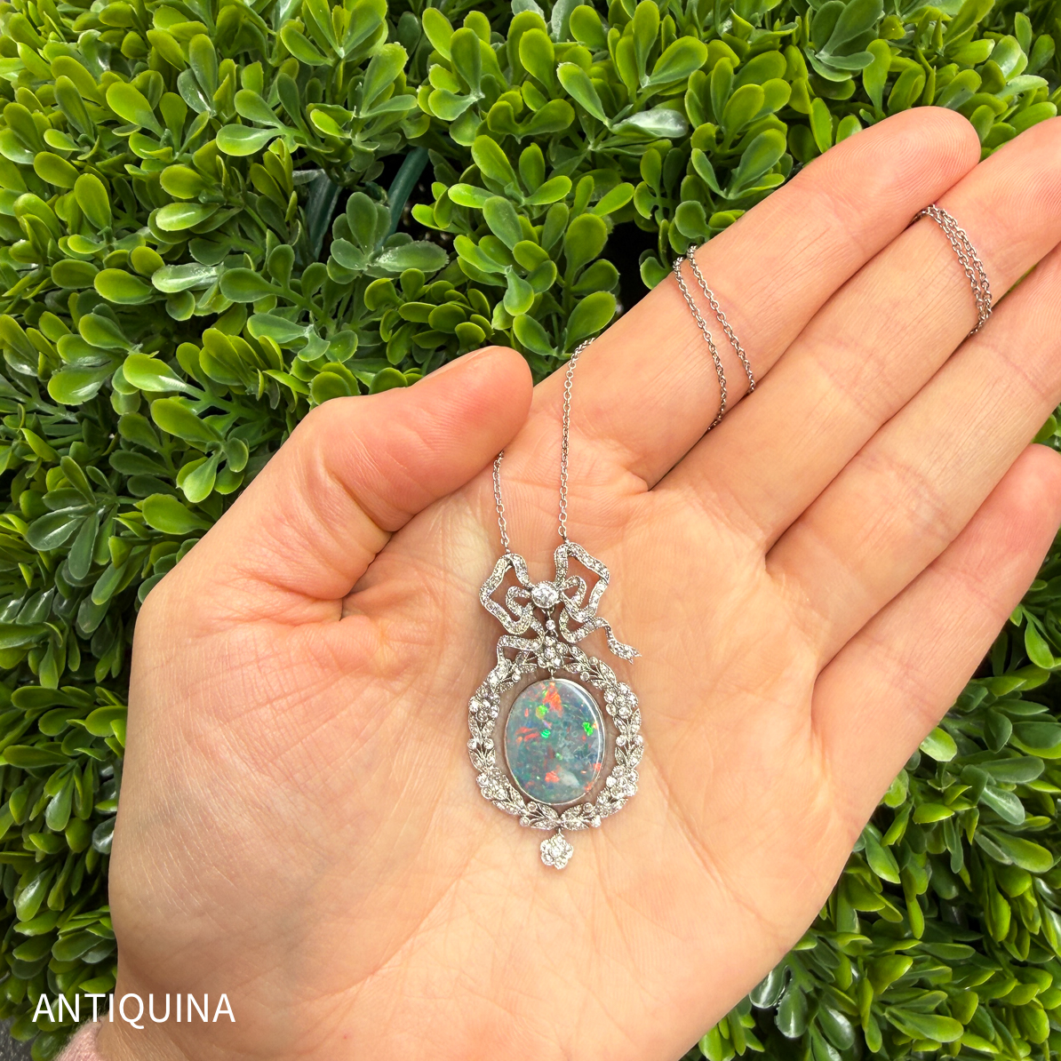 Im Zentrum dieser kunstvollen Gestaltung steht ein beeindruckender schwarzer Opal von beachtlicher Größe,