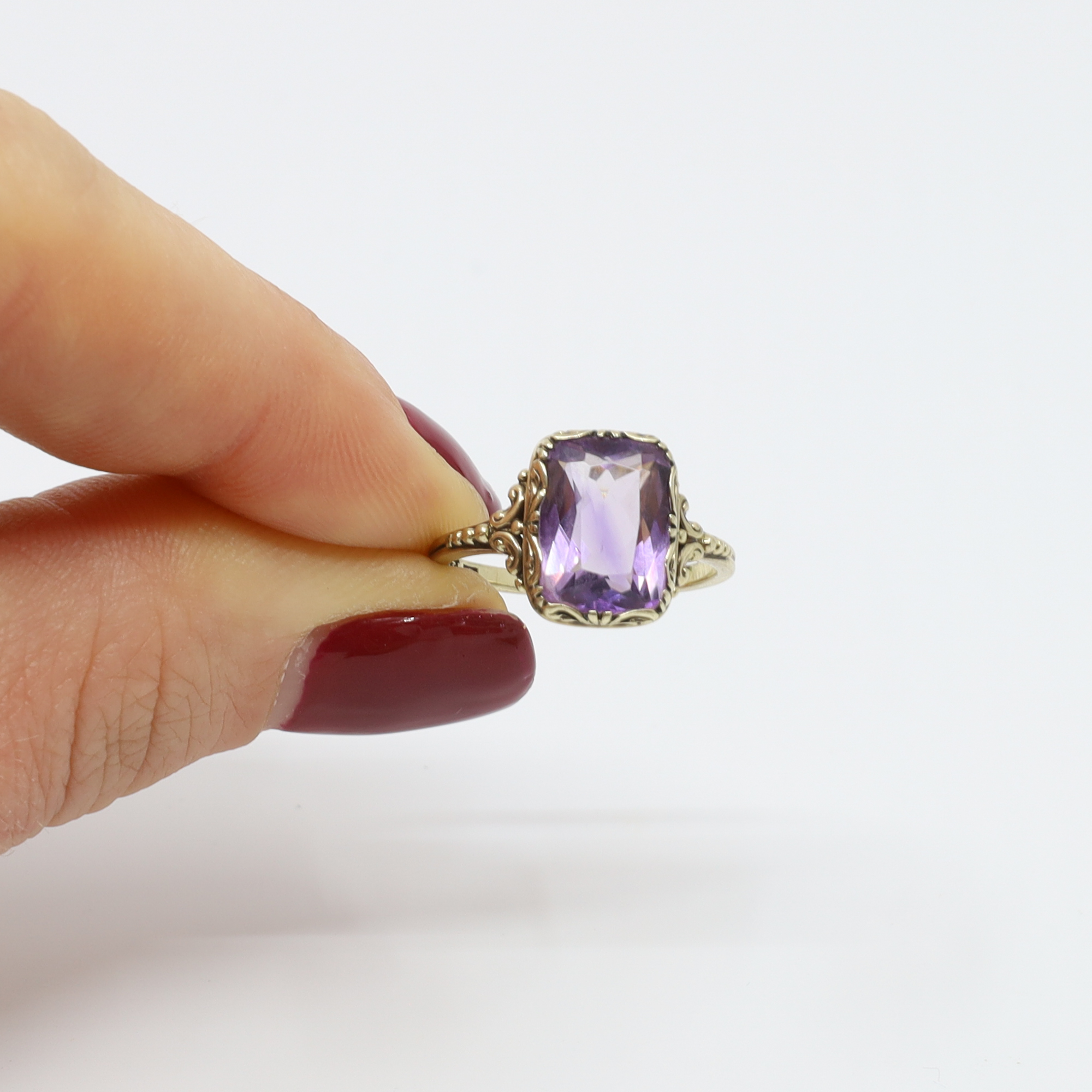Beautiful antique ring, turn of the century around 1890/1900, set in the middle with a rectangular lavender-colored amethyst, 333 yellow gold,