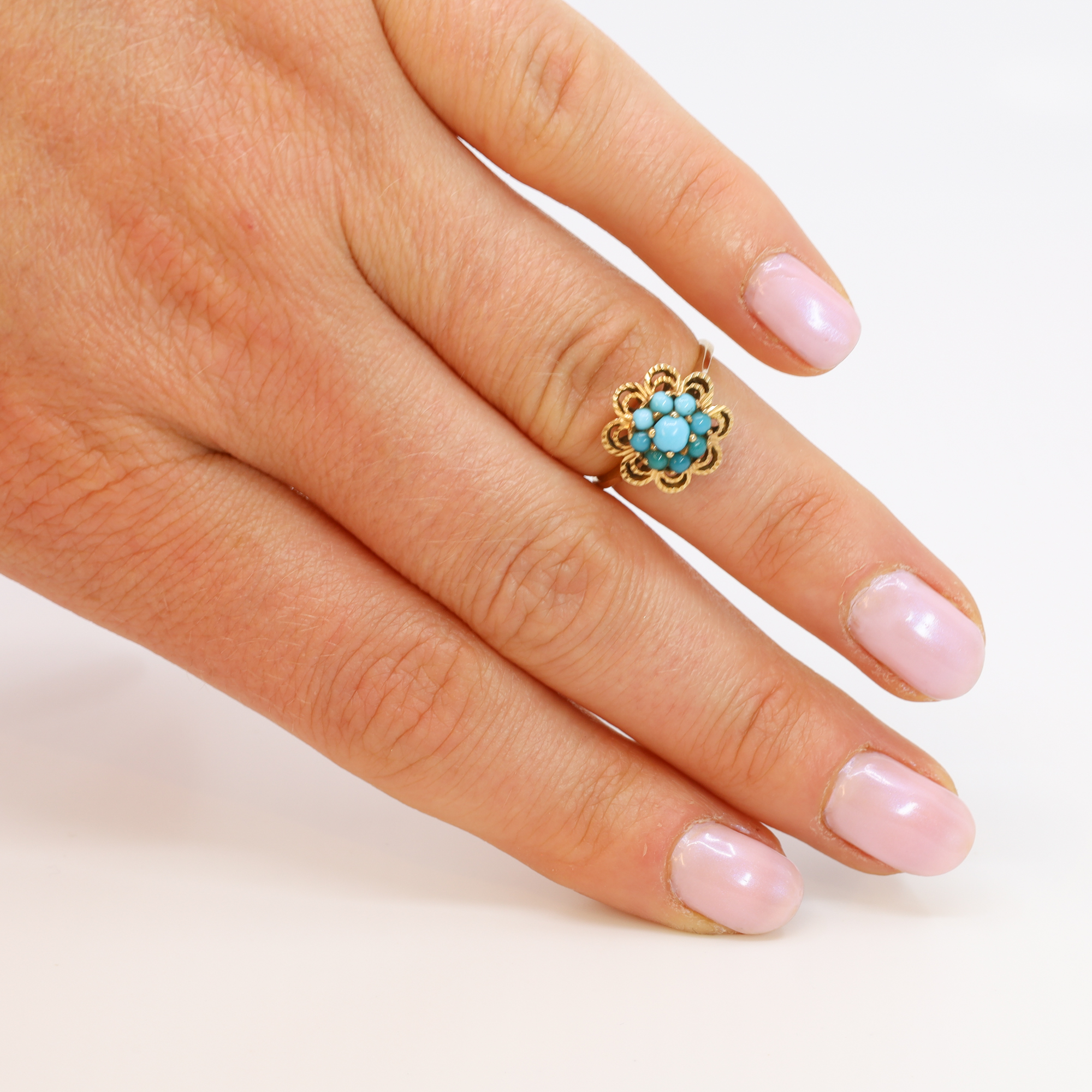 Wunderschöner, extravaganter und antiker Ring, Mitte 20. Jahrhundert, gearbeitet in 14 Karat Gelbgold, Blüte besetzt mit Türkisen,