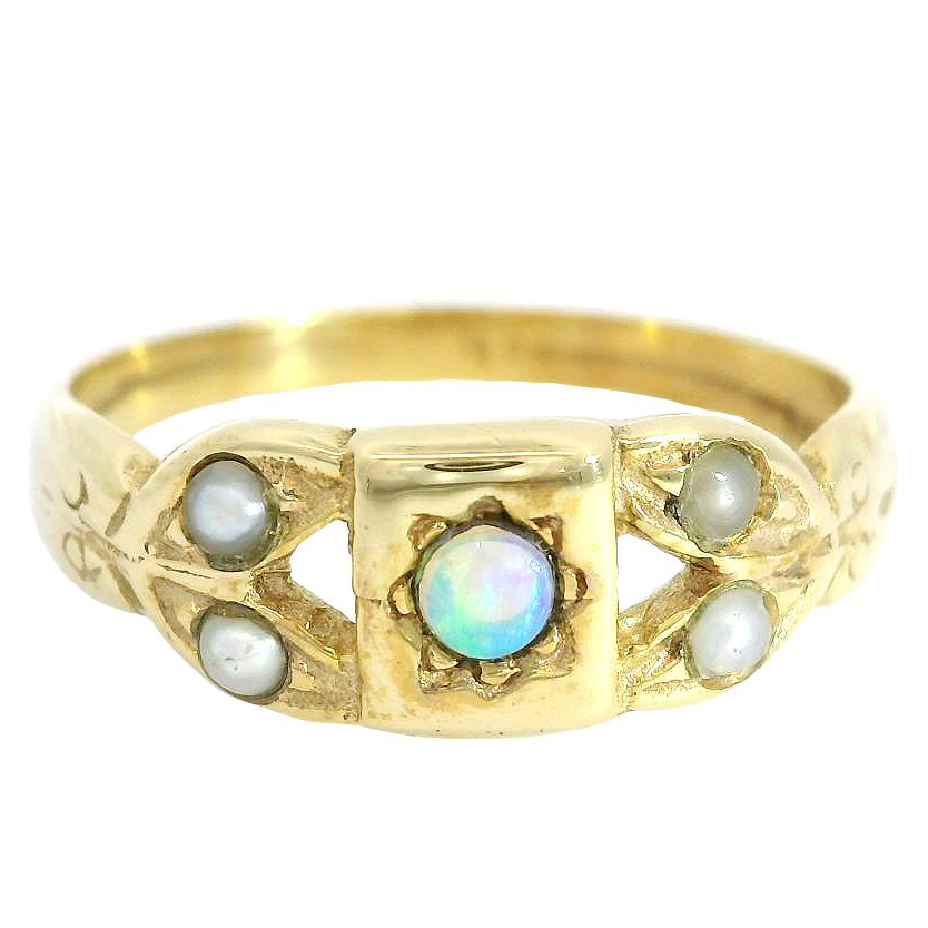 Material:       333 Gold, 1 x kleiner Opal Cabochon blau- grünes Farbspiel, Saatperlchen